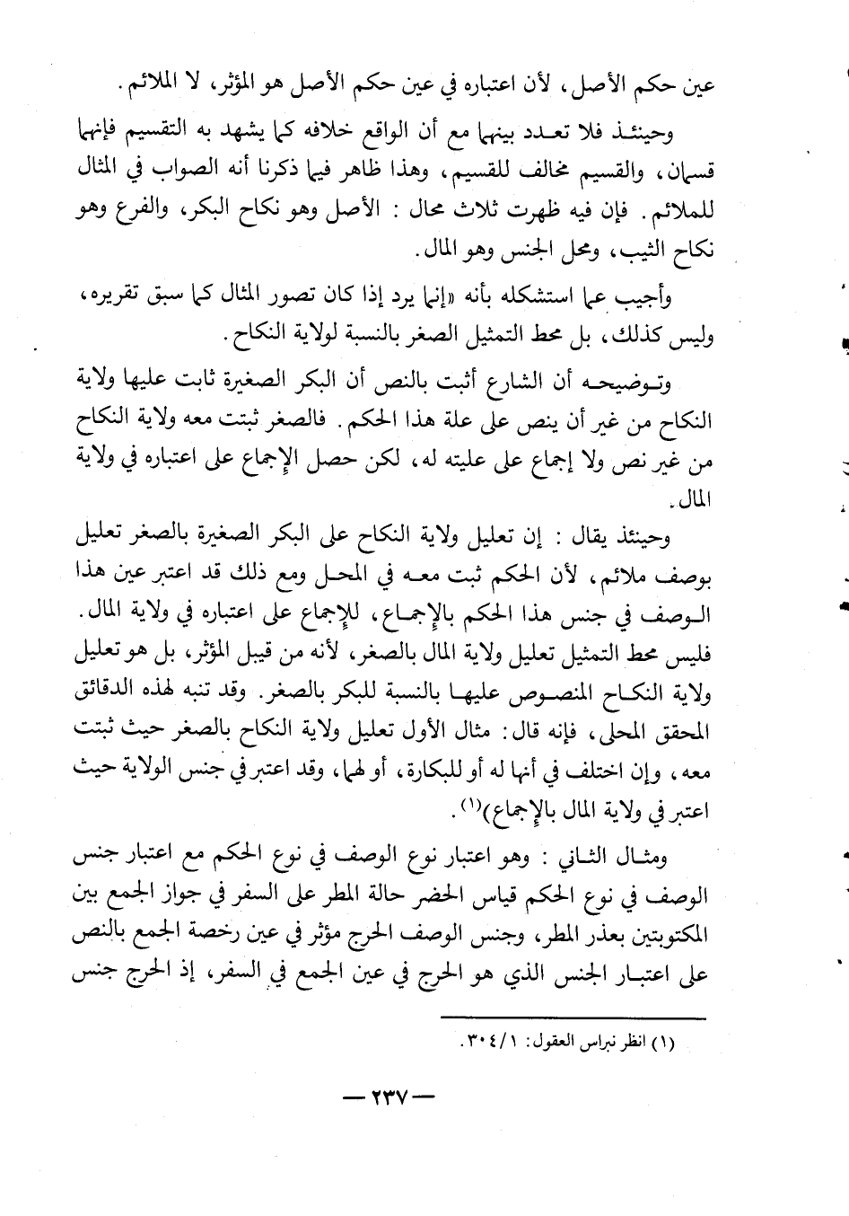 فليس محط التمثيل تعليل ولاية المال بالصغر، لأنه من قبيل المؤثر، بل هو تعليل ولاية النكاح المنصوص عليها بالنسبة للبكر بالصغر، وقد تنبه لهذه الدقائق محقق المحلى، فإنه قال: مثال الأول تعليل ولاية النكاح بالصغر حيث ثبتت معه، وإن اختلفت في أنها له أو للبكارة، أو لهما، وقد اعتبر في جنس الولاية حيث اعتبر في ولاية المال بالإجماع"1.