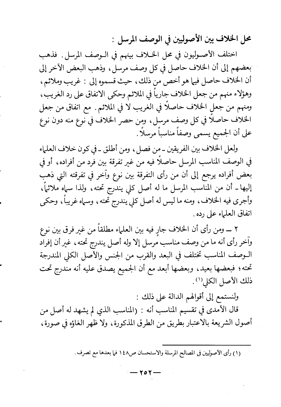 2 - ومن رأى أن الخلاف جارٍ فيه بين العلماء مطلقاً من غير فرق بين نوع وأخر رأى أنه ما من وصف مناسب مرسل إلا وله أصل يندرج تحته، غير أن إفراد الوصف المناسب تختلف في البعد والقرب من الجنس والأصل الكلي المندرجة تحته، فبعضها بعيد، وبعضها أبعد مع أن الجميع يصدق عليه أنه مندرج تحت ذلك الأصل الكلي1.