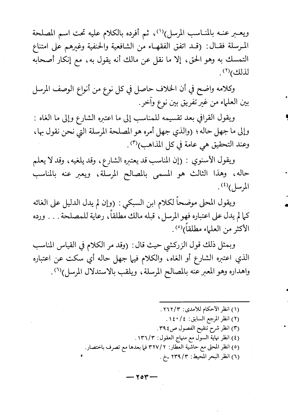 ويقول القرافي بعد تقسيمه للمناسب إلى ما اعتبره الشارع وإلى ما ألغاه: وإلى ما جهل حاله؛ "والذي جهل أمره هو المصلحة المرسلة التي نحن نقول بها، وعند التحقيق هي عامة في كل المذاهب"3.