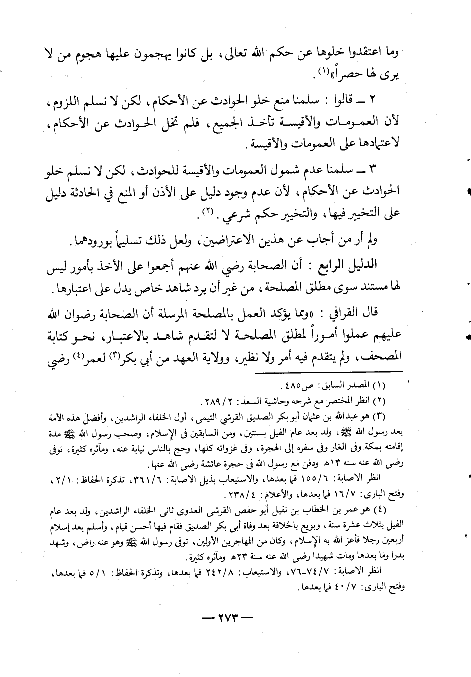قال القرافي: "ومما يؤكد العمل بالمصلحة المرسلة أن الصحابة رضوان الله عليهم عملوا أموراً لمطلق المصلحة لا لتقدم شاهد بالاعتبار، نحو كتابة المصحف، ولم يتقدم فيه أمر ولا نظير، وولاية العهد من أبي بكر3 لعمر4 رضي