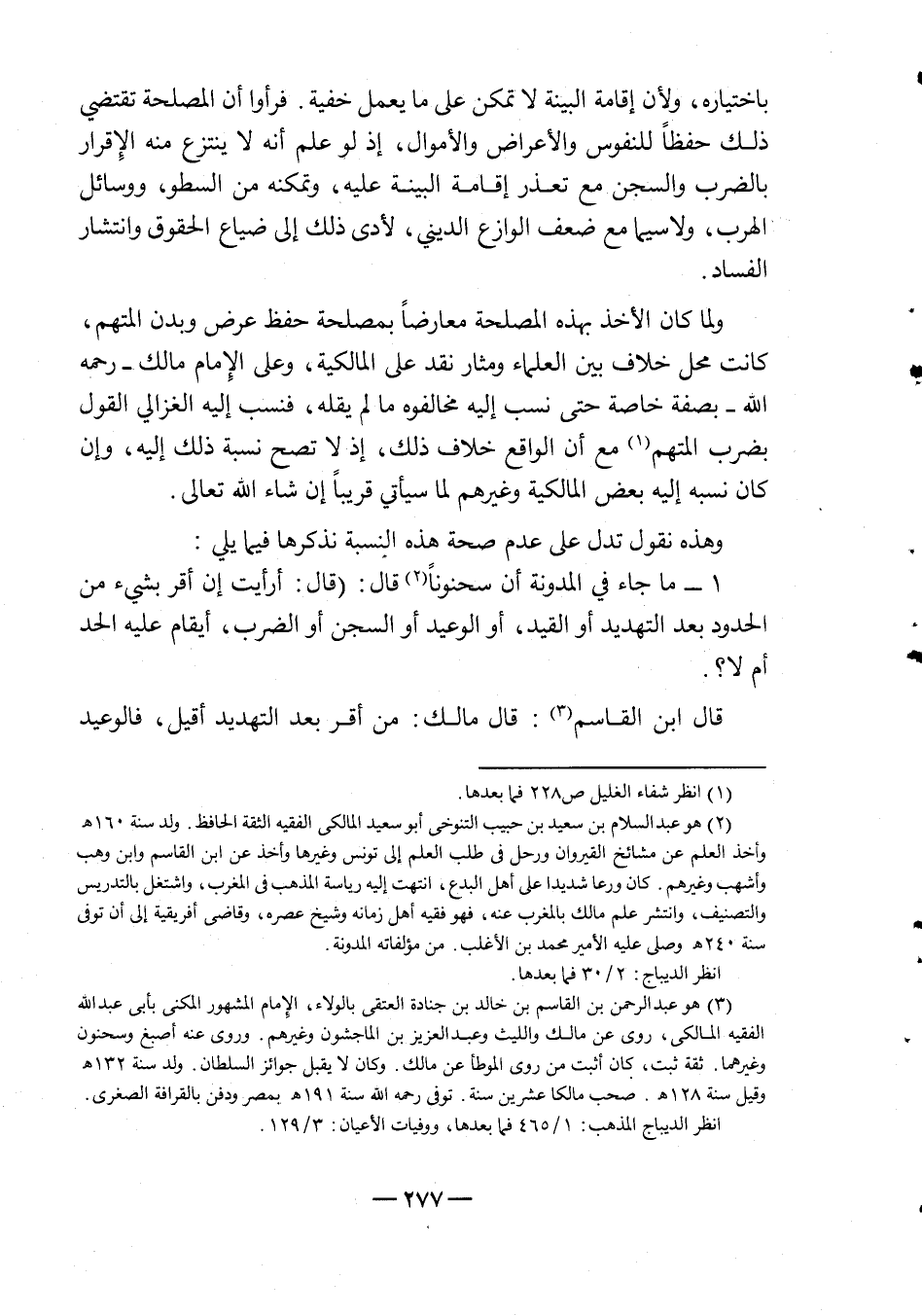2 هو: عبد السلام بن سعيد بن حبيب التنوخي أبو سعيد المالكي الفقيه الثقة الحافظ، ولد سنة 160هـ، وأخذ العلم عن مشائخ القيروان ورحل في طلب العلم إلى تونس وغيرها، وأخذ عن ابن القاسم وابن وهب وأشهب وغيرهم، كان ورعاً شديداً على أهل البدع، انتهت إليه رياسة المذهب في المغرب، واشتغل بالتدريس والتصنيف، وانتشر علم مالك بالمغرب عنه، فهو فقيه أهل زمانه وشيخ عصره، وقاضي إفريقية إلى أن توفي سنة 240هـ وصلى عليه الأمير محمد بن الأغلب، من مؤلفاته المدونة. انظر: الديباج 2/30 فما بعدها.