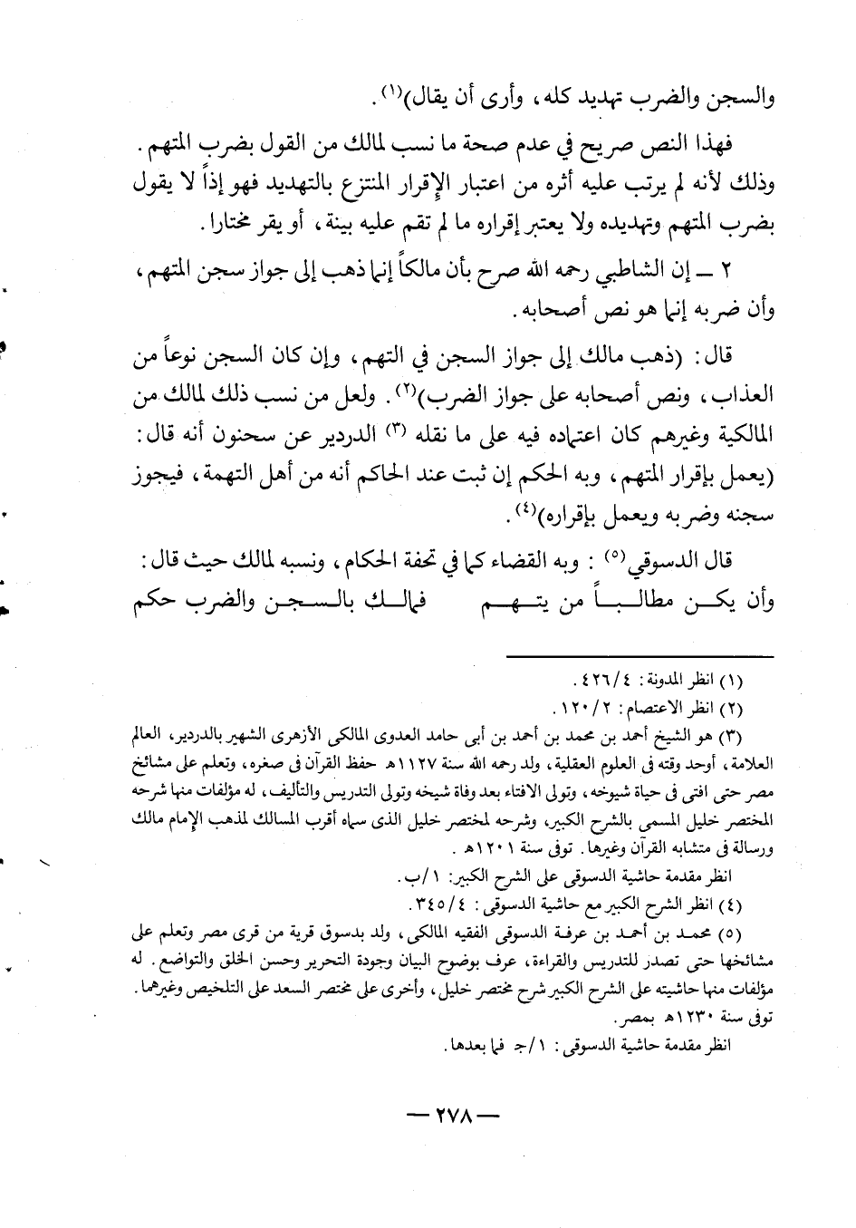 2 - إن الشاطبي رحمه الله صرح بأن مالكاً إنما ذهب إلى جواز سجن المتهم، وأن ضربه إنما هو نص أصحابه.