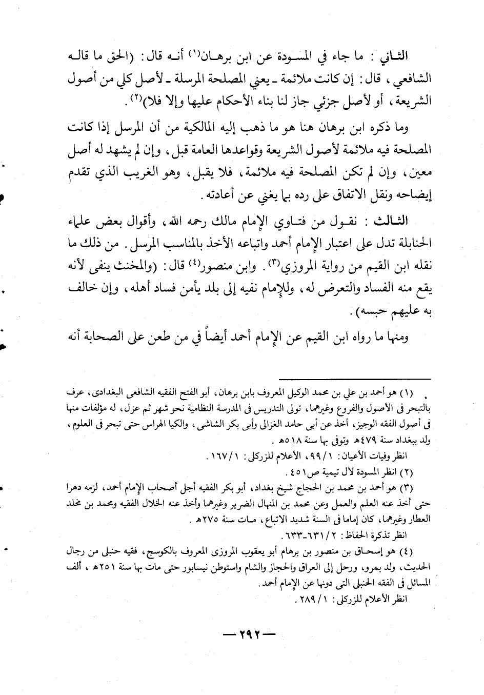 الثالث: نقول من فتاوى الإمام مالك رحمه الله، وأقوال بعض علماء الحنابلة تدل على اعتبار الإمام أحمد وأتباعه الآخذ بالمناسب المرسل، من ذلك ما نقله ابن القيم من رواية المروزي3، وابن منصور4، قال: "والمخنث يُنفى لأنه يقع منه الفساد والتعرض له، وللإمام نفيه إلى بلد يأمن فساد أهله، وإن خالف به عليهم حسبه".
