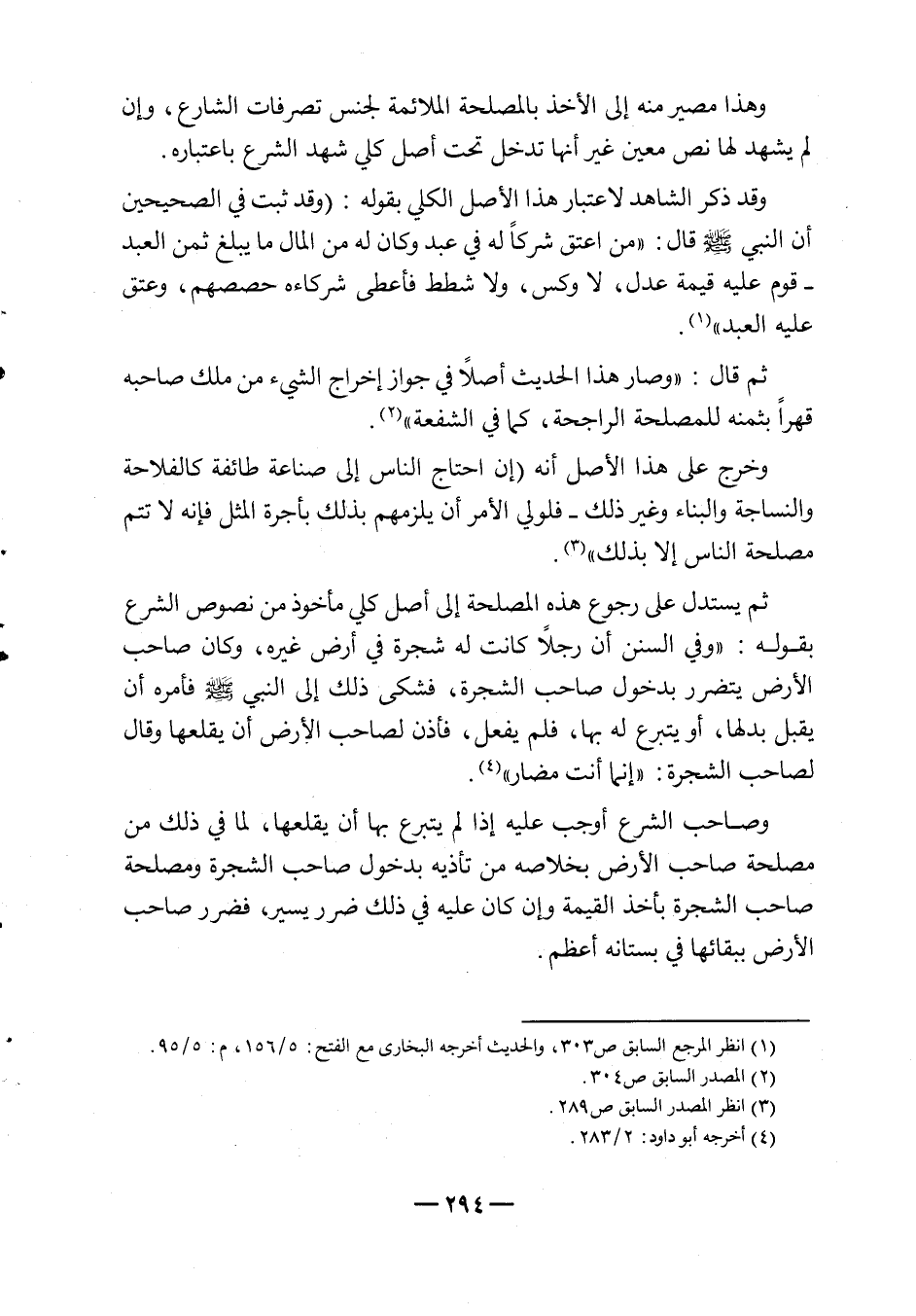 ثم يستدل على رجوع هذه المصلحة إلى أصل كلي مأخوذ من نصوص الشرع بقوله: "وفي السنن أن رجلاً كانت له شجرة في أرض غيره، وكان صاحب الأرض يتضرر بدخول صاحب الشجرة، فشكى ذلك إلى النبي صلى الله عليه وسلم فأمره أن يقبل بدلها، أو يتبرع له بها، فلم يفعل، فأذن لصاحب الأرض أن يقلعها وقال لصحاب الشجرة: "إنما أنت مضار" 4.