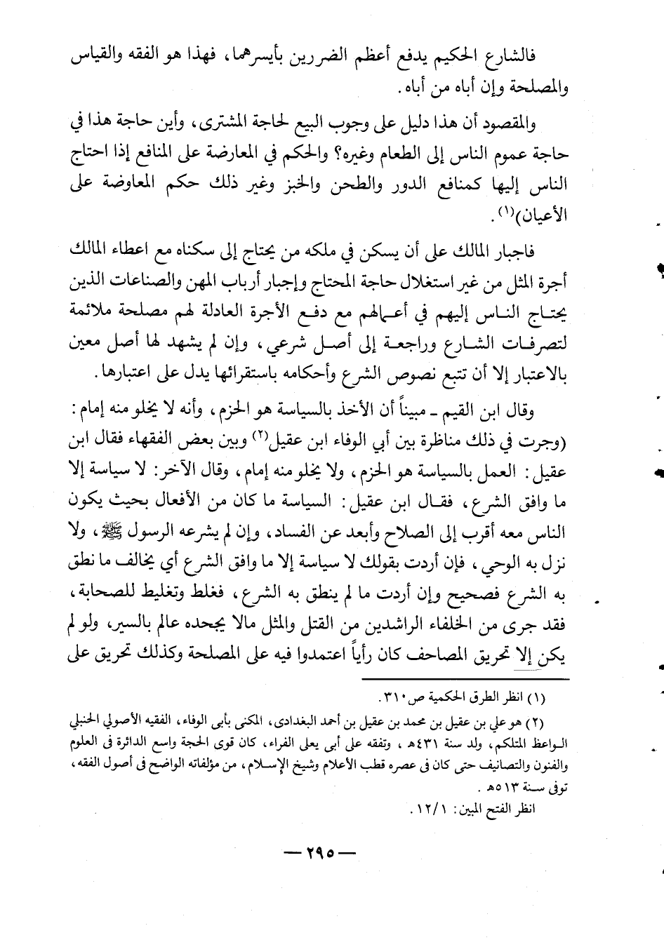 وقال ابن القيم - مبيناً أن الأخذ بالسياسة هو الحزم، وأنه لا يخلو منه إمام: "وجرت في ذلك مناظرة بين أبي الوفاء ابن عقيل2 وبين بعض الفقهاء، فقال ابن عقيل: العمل بالسياسة هو الحزم، ولا يخلو منه إمام، وقال الآخر: لا سياسة إلا ما وافق الشرع، فقال ابن عقيل: السياسة ما كان من الأفعال بحيث يكون الناس معه أقرب إلى الصلاح وأبعد عن الفساد، وإن لم يشرعه الرسول صلى الله عليه وسلم، ولا نزل به الوحي، فإن أردت بقولك لا سياسة إلا ما وافق الشرع أي يخالف ما نطق به الشرع فصحيح وإن أردت ما لم ينطق به الشرع، فغلط وتغليطه للصحابة، فقد جرى من الخلفاء الراشدين من القتل والمثل ما لا يجحده عالم بالسير، ولو لم يكن إلا تحريق المصاحف كان رأياً اعتمدوا فيه على المصلحة، وكذلك تحريق علي