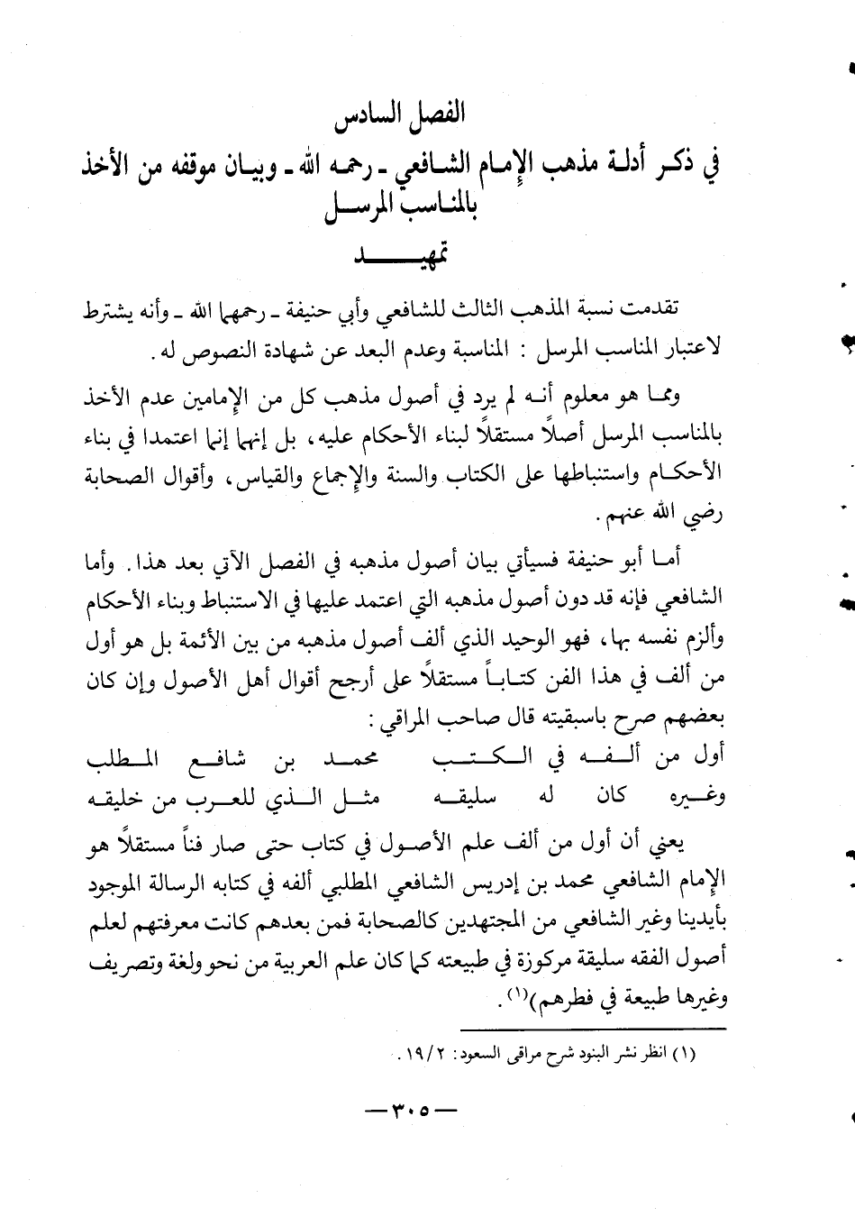 الفصل السادس في ذكر أدلة مذهب الإمام الشافعي - رحمه الله - وبيان موقفه من الأخذ بالمناسب المرسل