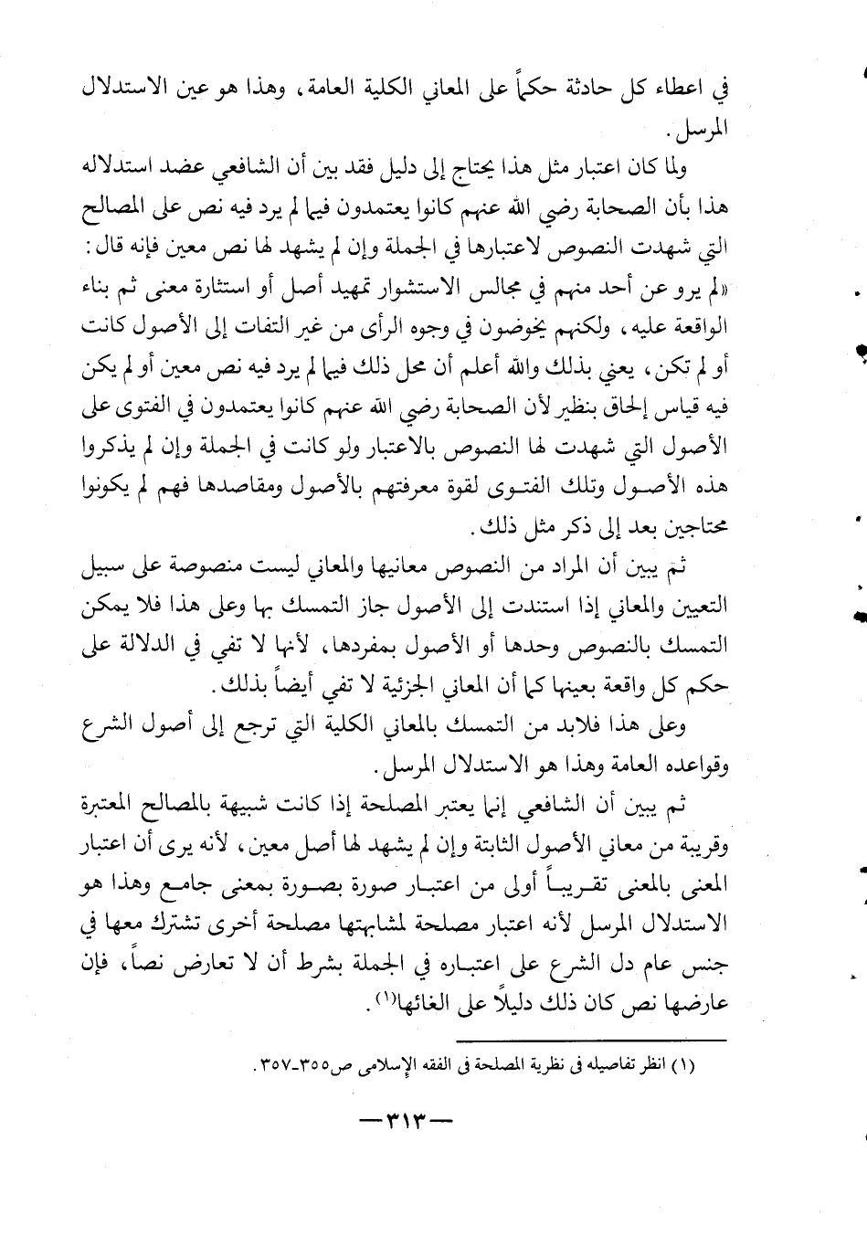 ولما كان اعتبار مثل هذا يحتاج إلى دليل فقد بين أن الشافعي عضد استدلاله هذا بأن الصحابة رضي الله عنهم كانوا يعتمدون فيما لم يرد فيه نص على المصالح التي شهدت النصوص لاعتبارها في الجملة، وإن لم يشهد لها نص معين فإنه قال: "لم يرو عن أحد منهم في مجالس الاستشوار تمهيد أصل أو استثارة معنى ثم بناء الواقعة عليه، ولكنهم يخوضون في وجوه الرأي من غير التفات إلى الأصول كانت أو لم تكن، يعني بذلك والله أعلم أن محل ذلك فيما لم يرد فيه نص ميعن أو لم يكن فيه قياس إلحاق بنظير، لأن الصحابة رضي الله عنهم كانوا يعتمدون في الفتوى على الأصول التي شهدت لها النصوص بالاعتبار ولو كانت في الجملة وإن لم يذكروا هذه الأصول وتلك الفتوى لقوة معرفتهم بالأصول ومقاصدها فهم لم يكونوا محتاجين بعد إلى ذكر مثل ذلك.