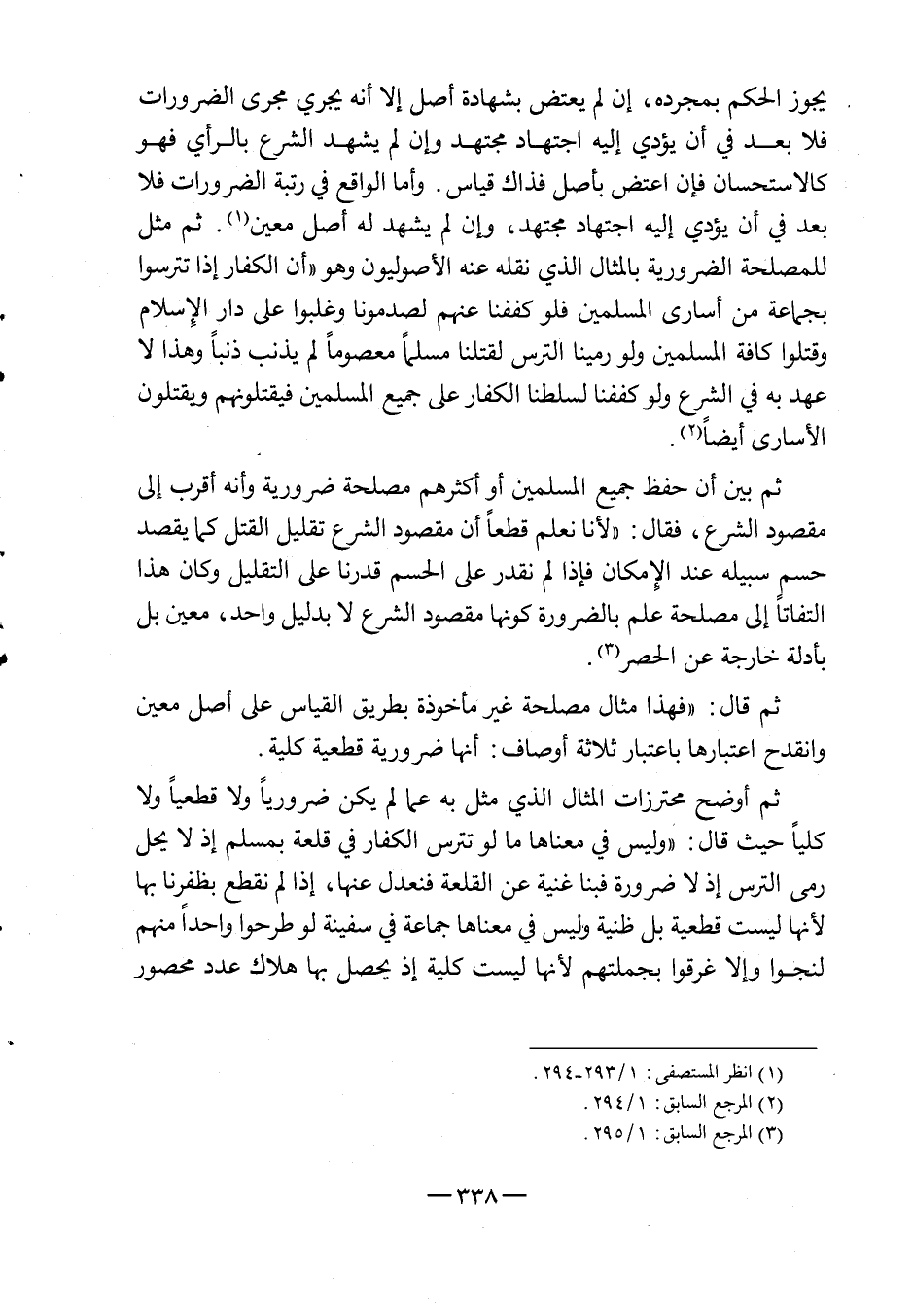 ثم بين أن حفظ جميع المسلمين أو أكثرهم مصلحة ضرورية، وأنه أقرب إلى مقصود الشرع، فقال: "لأنا نعلم قطعاً أن مقصود الشرع تقليل القتل، كما يقصد حسم سبيله عند الإمكان، فإذا لم نقدر على الحسم، قدرنا على التقليل، وكان هذا التفاتاً إلى مصلحة علم بالضرورة، كونها مقصود الشرع لا بدليل واحد معين، بل بأدلة خارجة عن الحصر3.