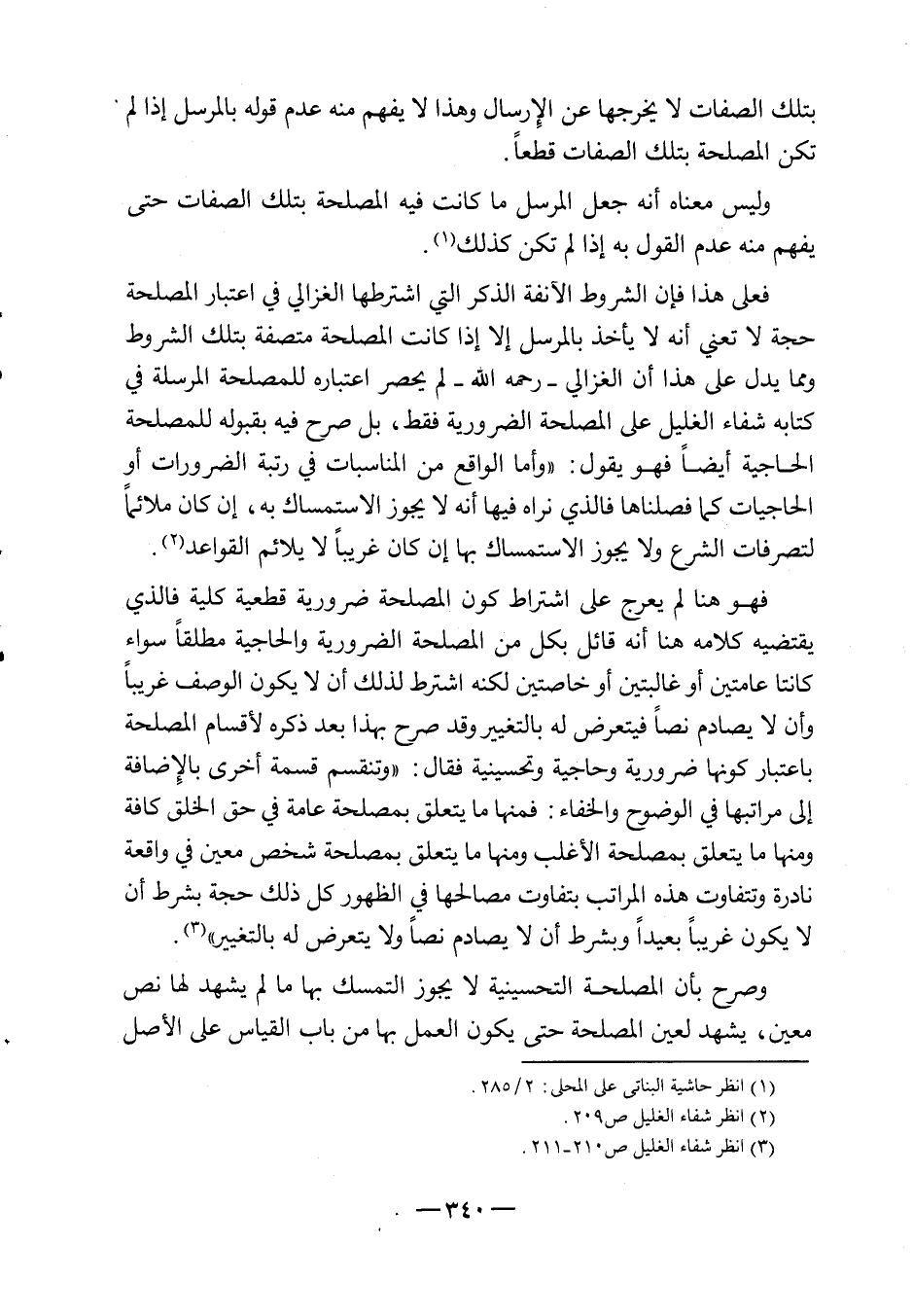 فعلى هذا فإن الشروط الآنفة الذكر، التي اشترطها الغزالي في اعتبار المصلحة حجة لا تعني أنه لا يأخذ بالمرسل، إلا إذا كانت المصلحة متصفة بتلك الشروط، ومما يدل على هذا أن الغزالي - رحمه الله - لم يحصر اعتباره للمصلحة المرسلة في كتابه شفاء الغليل على المصلحة الضرورية فقط، بل صرح فيه بقبوله للمصلحة الحاجية أيضاً، فهو يقول: "وأما الواقع من المناسبات في رتبة الضرورات أو الحاجيات، كما فصلناها فالذي نراه فيها أنه لا يجوز الاستمساك بها، إن كان ملائماً لتصرفات الشرع، ولا يجوز الاستمساك بها إن كان غريباً لا يلائم القواعد2.