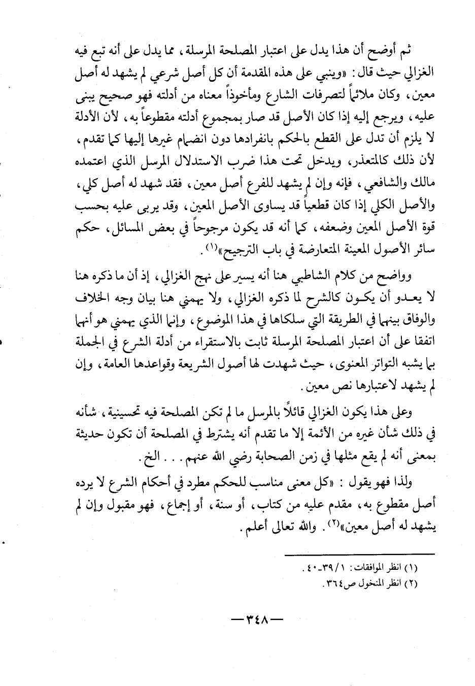 وواضح من كلام الشاطبي هنا أنه يسير على نهج الغزالي، إذ أن ما ذكره هنا لا يعدو أن يكون كالشرح لما ذكره الغزالي، ولا يهمني هنا بيان وجه الخلاف والوفاق بينهما في الطريقة التي سلكاها في هذا الموضوع، وإنما الذي يهمني هو أنهما اتفقا على أن اعتبار المصلحة المرسلة ثابت بالاستقراء من أدلة الشرع في الجملة بما يشبه التواتر المعنوي، حيث شهدت لها أصول الشريعة وقواعدها العامة، وإن لم يشهد لاعتبارها نص معين.