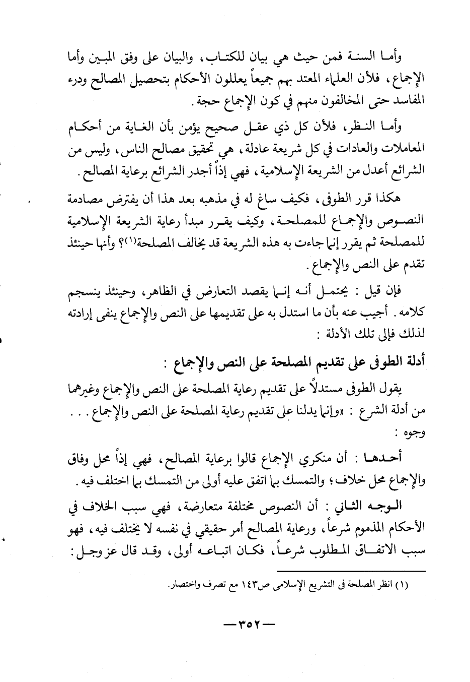 يقول الطوفي مستدلاً على تقديم رعاية المصلحة على النص والإجماع وغيرهما من أدلة الشرع: "وإنما يدلنا على تقديم رعاية المصلحة على النص والإجماع ... وجوه: