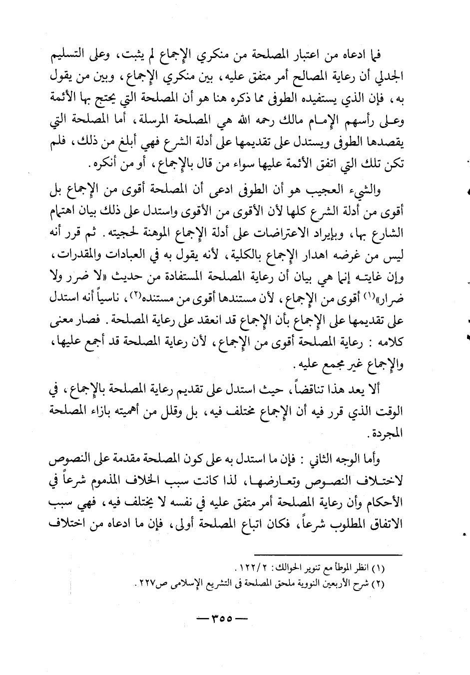فما ادعاه من اعتبار المصلحة من منكري الإجماع لم يثبت، وعلى التسليم الجدلي أن رعاية المصالح أمر متفق عليه، بين منكري الإجماع، وبين من يقول به، فإن الذي يستفيده الطوفي مما ذكره هنا هو أن المصلحة التي يحتج بها الأئمة وعلى رأسهم الإمام مالك رحمه الله هي المصلحة المرسلة، أما المصلحة التي يقصدها الطوفي ويستدل على تقديمها على أدلة الشرع فهي أبلغ من ذلك، فلم تكن تلك التي اتفق الأئمة عليها، سواء من قال بالإجماع، أو من أنكره.