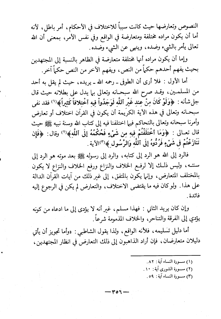 أما الأول: فلا أرى أن الطوفي - رحمه الله - يريده، حيث لم يقل به أحد من المسلمين، وقد صرح الله سبحانه وتعالى بما يدل على بطلانه حيث قال جل شأنه: {وَلَوْ كَانَ مِنْ عِندِ غَيْرِ اللهِ لَوَجَدُواْ فِيهِ اخْتِلاَفًا كَثِيراً} 1، فقد نفى سبحانه وتعالى في هذه الآية الكريمة أن يكون في القرآن اختلاف أو تعارض، وأمرنا سبحانه وتعال بالتحاكم فيما اختلفنا فيه إلى كتاب الله وسنة نبيه صلى الله عليه وسلم حيث قال تعالى: {وَمَا اخْتَلَفْتُمْ فِيهِ مِن شَيْءٍ فَحُكْمُهُ إِلَى اللَّهِ} 2، وقال: {فَإِن تَنَازَعْتُمْ فِي شَيْءٍ فَرُدُّوهُ إِلَى اللهِ وَالرَّسُولِ} 3 الآية.