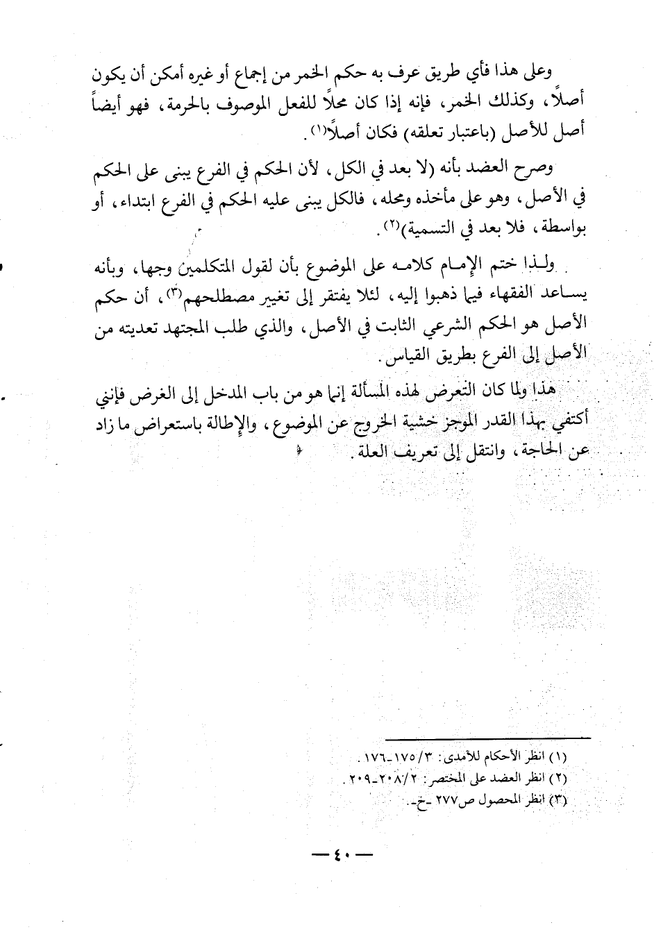 ولذا ختم الإمام كلامه على الموضوع بأن لقول المتكلمين وجهاً، وبأنه يساعد الفقهاء فيما ذهبوا إليه، لئلا يفتقر إلى تغيير مصطلحهم3، أن حكم الأصل هو الحكم الشرعي الثابت في الأصل، والذي يطلب المجتهد تعديته من الأصل إلى الفرع بطريق القياس.