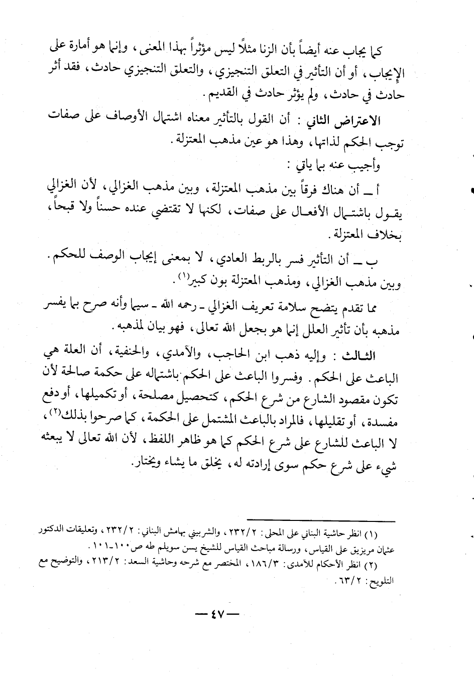 ب - أن التأثير فسر بالربط العادي، لا بمعنى إيجاب الوصف للحكم. وبين مذهب الغزالي، ومذهب المعتزلة بون كبير1.