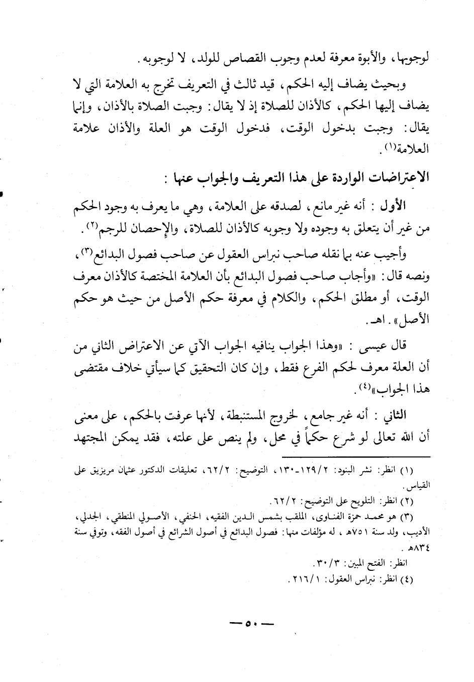 وأجيب عنه بما نقله صاحب نبراس العقول عن صاحب فصول البدائع3، ونصه قال: "وأجاب صاحب فصول البدائع بأن العلامة المختصة كالأذان معرف الوقت، أو مطلق الحكم، والكلام في معرفة حكم الأصل من حيث هو حكم الأصل".ا. هـ