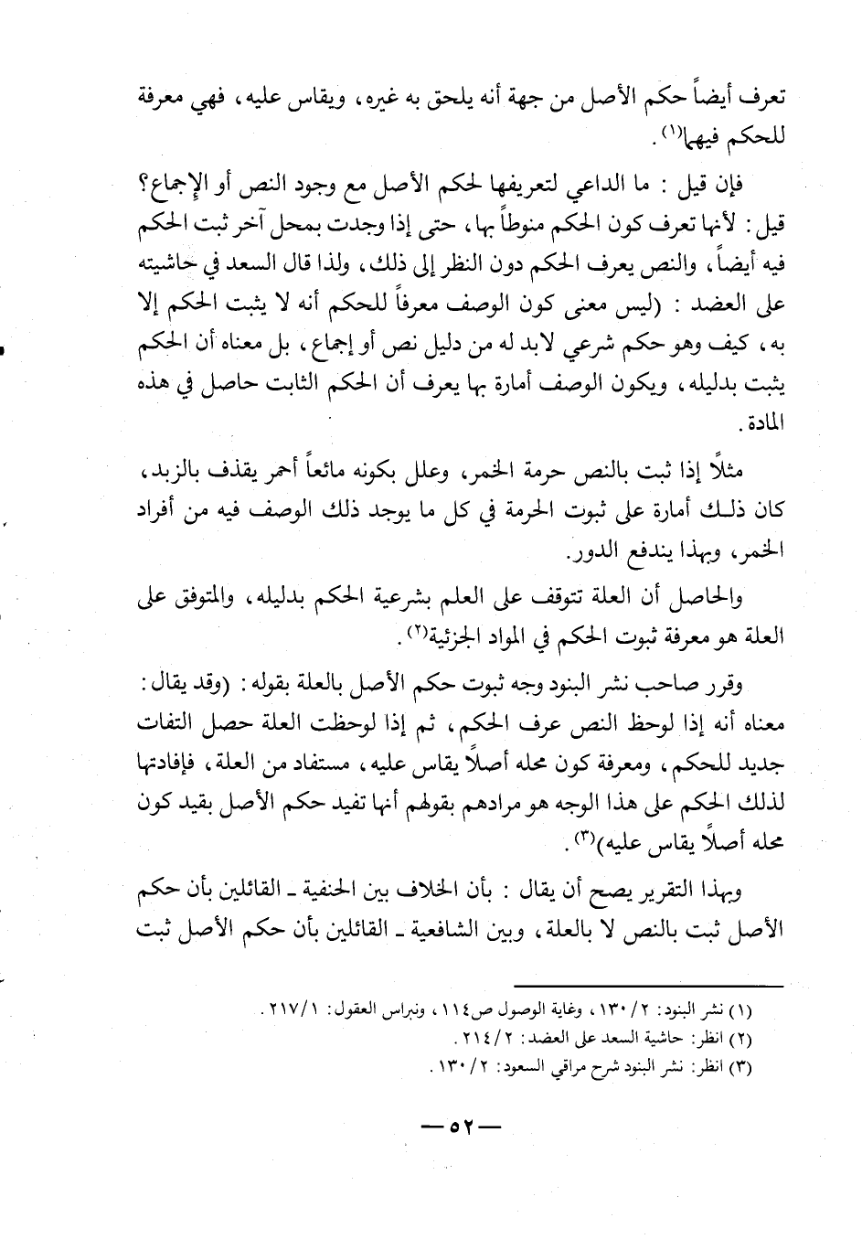 وقرر صاحب نشر البنود وجه ثبوت حكم الأصل بالعلة بقوله: "وقد يقال: معناه أنه إذا لوحظ النص عرف الحكم، ثم إذا لوحظت العلة حصل التفات جديد للحكم، ومعرفة كون محله أصلاً يقاس عليه، مستفاد من العلة، فإفادتها لذلك الحكم على هذا الوجه هو مرادهم بقولهم أنها تفيد حكم الأصل بقيد كون محله أصلاً يقاس عليه"3.