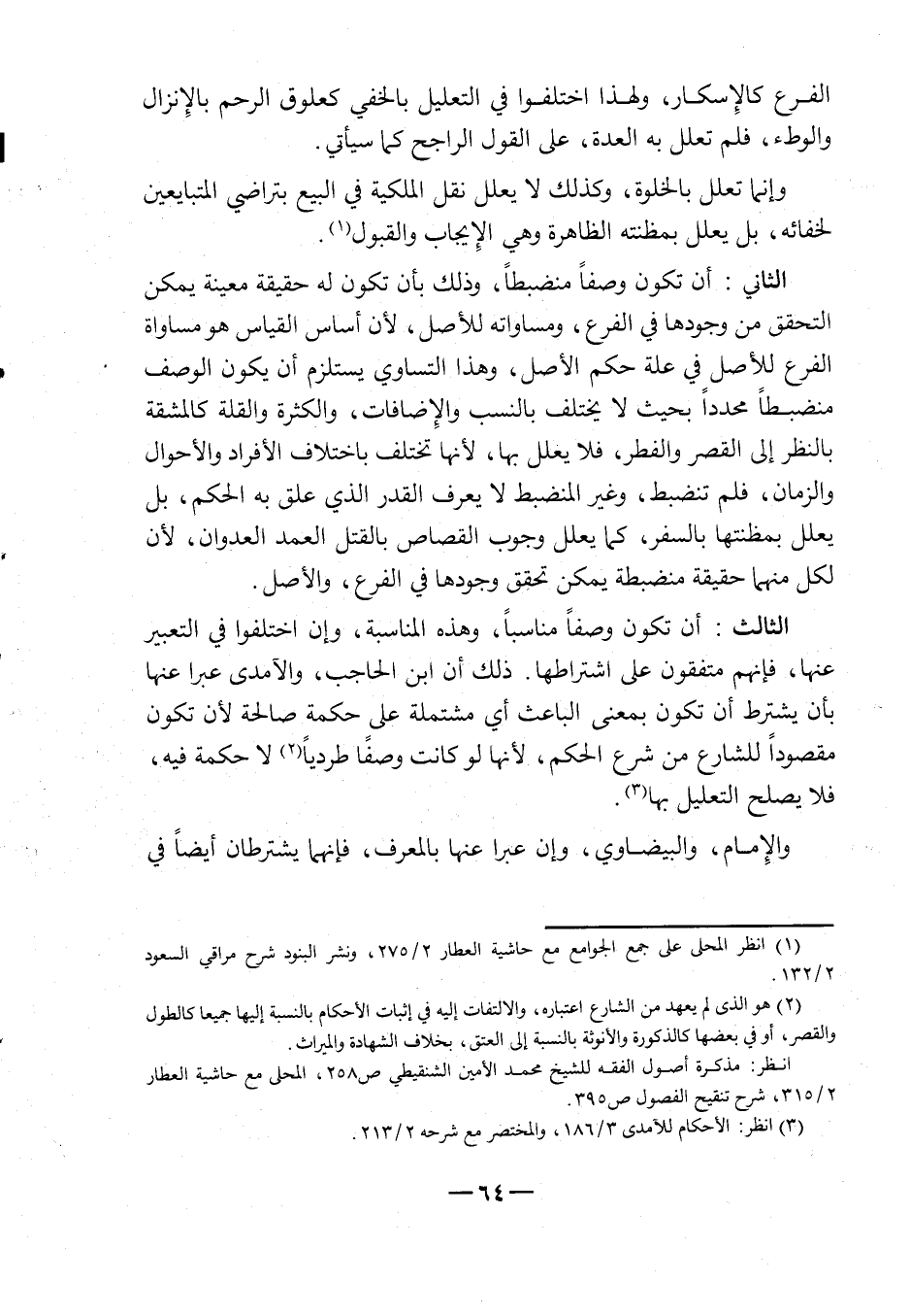 الثاني: أن تكون وصفاً منضبطاً، وذلك بأن تكون له حقيقة معينة يمكن التحقق من وجودها في الفرع، ومساواته للأصل، لأن أساس القياس هو مساواة الفرع للأصل في علة حكم الأصل، وهذا التساوي يستلزم أن يكون الوصف منضبطاً محدداً بحيث لا يختلف بالنسب والإضافات، والكثرة والقلة، كالمشقة بالنظر إلى القصر والفطر، فلا يعلل بها، لأنها تختلف باختلاف الأفراد والأحوال والزمان، فلم تنضبط، وغير المنضبط لا يعرف القدر الذي علق به الحكم، بل يعلل بمظنتها بالسفر، كمل يعلل وجوب القصاص بالقتل العمد العدوان، لأن لكل منهما حقيقة منضبطة يمكن تحقق وجودها في الفرع، والأصل.