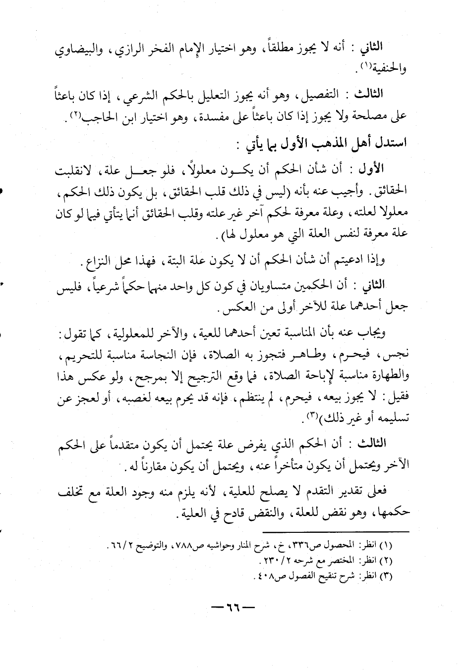 الثالث: التفصيل، وهو أنه يجوز التعليل بالحكم الشرعي، إذا كان باعثاً على مصلحة ولا يجوز إذا كان باعثاً على مفسدة، وهو اختيار ابن الحاجب2.