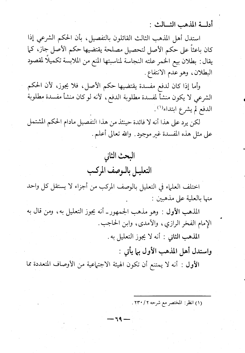 استدل أهل المذهب الثالث القائلون بالتفصيل، بأن الحكم الشرعي إذا كان باعثاً على حكم الأصل لتحصيل مصلحة يقتضيها حكم الأصل جاز، كما يقال: بطلان بيع الخمر علته النجاسة لمناسبتها المنع من الملابسة تكميلاً لمقصود البطلان، وهو عدم الانتفاع.