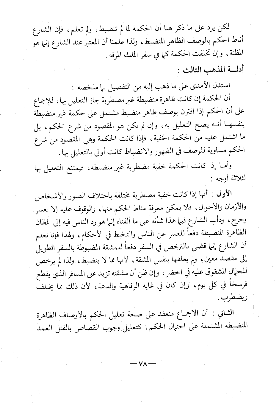 الأول: أنها إذا كانت خفية مضطربة مختلفة باختلاف الصور والأشخاص والأزمان والأحوال، فلا يمكن معرفة مناط الحكم منها، والوقوف عليه إلا بعسر وحرج، ودأب الشارع فيما هذا شأنه على ما ألفناه إنما هو رد الناس فيه إلى المظان الظاهرة المنضبطة دفعاً للعسر عن الناس والتخبط في الأحكام، ولهذا فإنا نعلم أن الشارع إنما قضى بالترخيص في السفر دفعاً للمشقة المضبوطة بالسفر الطويل إلى مقصد معين، ولم يعلقها بنفس المشقة، لأنها مما لا ينضبط، ولذا لم يرخص للحمال المشقوق عليه في الحضر، وإن ظن أن مشقته تزيد على المسافر الذي يقطع فرسخاً في كل يوم، وإن كان في غاية الرفاهية والدعة؛ لأن ذلك مما يختلف ويضطرب.