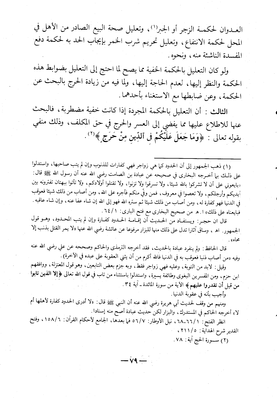 العدوان لحكمة الزجر أو الجبر1، وتعليل صحة البيع الصادر من الأهل في المحل لحكمة الانتفاع، وتعليل تحريم شرب الخمر بإيجاب الحد به لحكمة دفع المفسدة الناشئة منه، ونحوه.