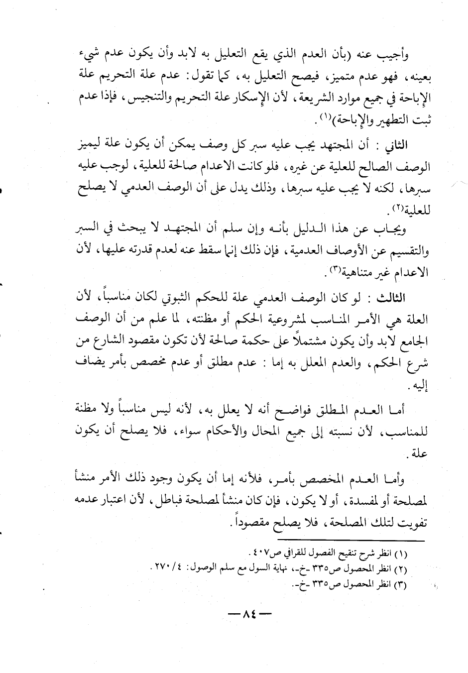 أما العدم المطلق فواضح أنه لا يعلل به، لأنه ليس مناسباً ولا مظنة للمناسب، لأنه نسبته إلى جميع المحال والأحكام سواء، فلا يصلح أن يكون علة.
