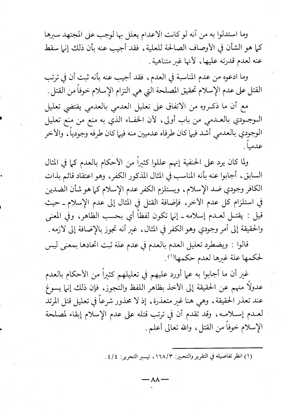 غير أن ما أجابوا به عما أورد عليهم في تعليلهم كثيراً من الأحكام بالعدم عدولاً منهم عن الحقيقة إلى الأخذ بظاهر اللفظ والتجوز، فإن ذلك إنما يسوغ عند تعذر الحقيقة، وهي هنا غير متعذرة، إذ لا محذور شرعاً في تعليل قتل المرتد لعدم إسلامه، وقد تقدم أن في ترتب قتله على عدم الإسلام إبقاء لمصلحة الإسلام خوفاً من القتل، والله تعالى أعلم.