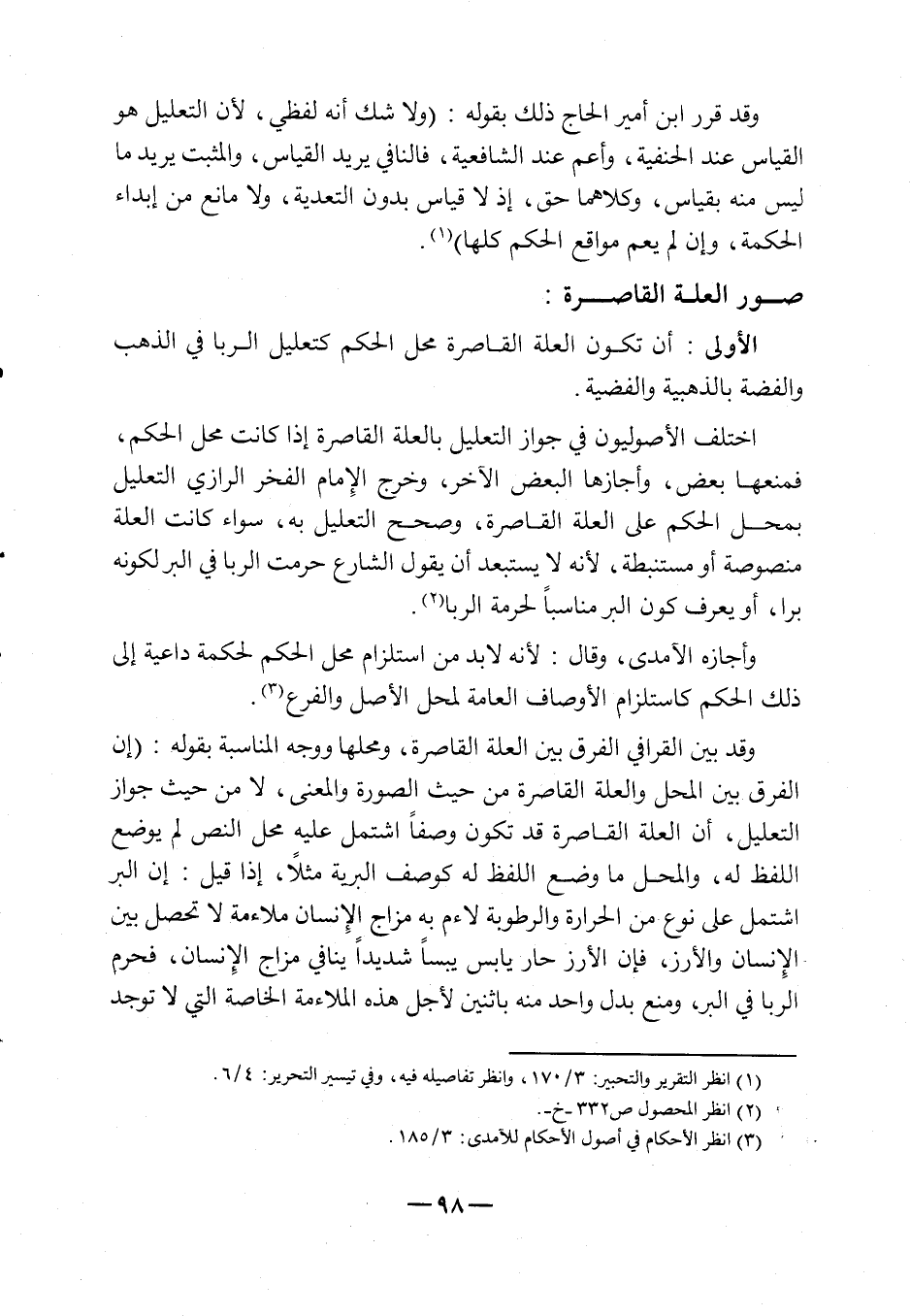 اختلف الأصوليون في جواز التعليل بالعلة القاصرة إذا كانت محل الحكم، فمنعها بعض، وأجازها البعض الآخر، وخرج الإمام الفخر الرازي التعليل بمحل الحكم على العلة القاصرة، وصحح التعليل به، سواء كانت العلة منصوصة أو مستنبطة، لأنه لا يستبعد أن يقول الشارع حرمت الربا في البر لكونه براً، أن يعرف كون البر مناسباً لحرمة الربا2.