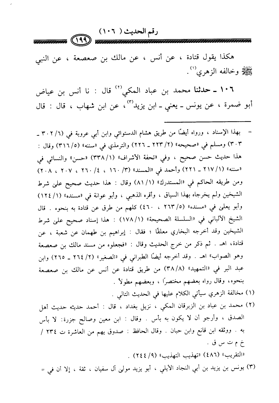 ١٠٦ - حَدثنَا مُحَمَّد بن عباد الْمَكِّيّ قَالَ: نَا أنس بن عِيَاض أَبُو ضَمرَة، عَن يُونُس - يَعْنِي - ابْن يزِيد، عَن ابْن شهَاب، قَالَ: قَالَ