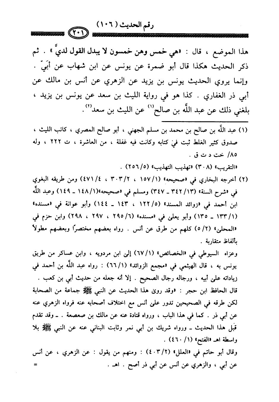 هَذَا الْموضع، قَالَ: " هِيَ خمس وَهن خَمْسُونَ لَا يُبدل القَوْل لديَّ ". ثمَّ ذكر الحَدِيث هَكَذَا قَالَ أَبُو ضَمرَة عَن يُونُس عَن ابْن شهَاب عَن أبَيّ. وَإِنَّمَا يروي الحَدِيث يُونُس بن يزِيد عَن الزُّهْرِيّ عَن أنس بن مَالك عَن أبي ذَر الْغِفَارِيّ. كَذَا هُوَ فِي رِوَايَة اللَّيْث بن سعد عَن يُونُس بن يزِيد، بَلغنِي ذَلِك عَن عبد الله بن صَالح عَن اللَّيْث بن سعد.