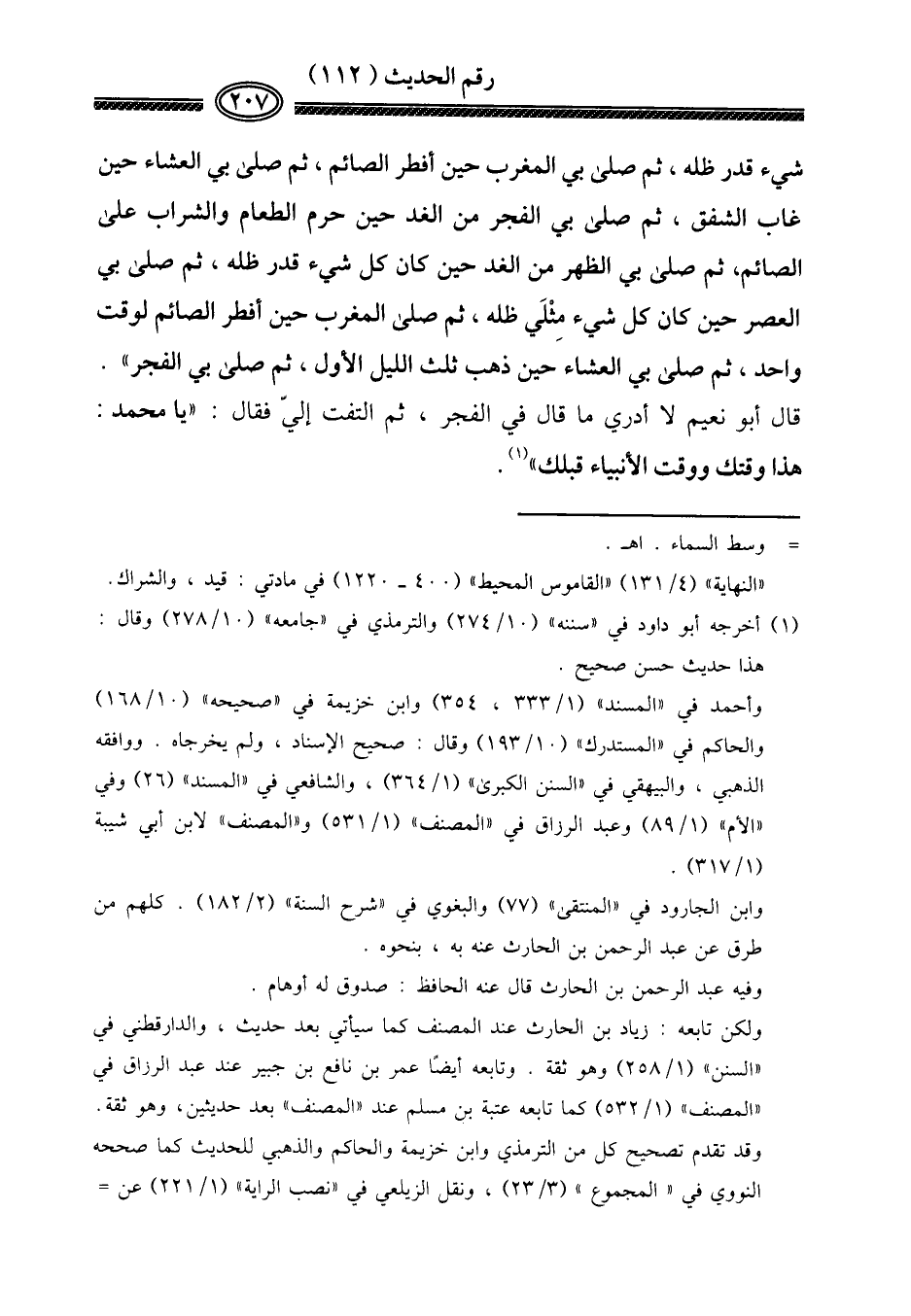 شَيْء قدر ظله، ثمَّ صلى بِي الْمغرب حِين أفطر الصَّائِم، ثمَّ صلى بِي الْعشَاء حِين غَابَ الشَّفق، ثمَّ صلى بِي الْفجْر من الْغَد حِين حرم الطَّعَام وَالشرَاب على الصَّائِم، ثمَّ صلى بِي الظّهْر من الْغَد حِين كَانَ كل شَيْء قدر ظله، ثمَّ صلى بِي الْعَصْر حِين كَانَ كل شَيْء مِثْلَي ظله، ثمَّ صلى الْمغرب حِين أفطر الصَّائِم لوقت وَاحِد، ثمَّ صلى بِي الْعشَاء حِين ذهب ثلث اللَّيْل الأول، ثمَّ صلى بِي الْفجْر ".