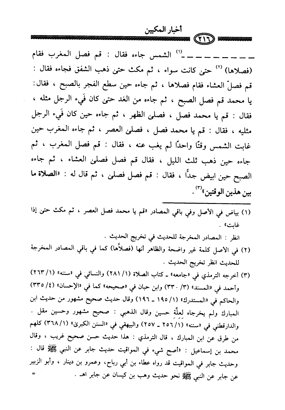 - الشَّمْس جَاءَهُ فَقَالَ: قُم فصل الْمغرب فَقَامَ (فَصلاهَا) حَتَّى كَانَت سَوَاء، ثمَّ مكث حَتَّى ذهب الشَّفق فَجَاءَهُ فَقَالَ: قُم فصلّ الْعشَاء فَقَامَ فَصلاهَا، ثمَّ جَاءَهُ حِين سَطَعَ الْفجْر بالصبح، فَقَالَ: يَا مُحَمَّد قُم فصل الصُّبْح، ثمَّ جَاءَهُ من الْغَد حَتَّى كَانَ فَيء الرجل مثله، فَقَالَ: قُم يَا مُحَمَّد فصل، فصلى الظّهْر، ثمَّ جَاءَهُ حِين كَانَ فَيء الرجل مثلَيْهِ، فَقَالَ: قُم يَا مُحَمَّد فصل، فصلى الْعَصْر، ثمَّ جَاءَهُ الْمغرب حِين غَابَتْ الشَّمْس وقتا وَاحِدًا لم يغب عَنهُ، فَقَالَ: قُم فصل الْمغرب، ثمَّ جَاءَهُ حِين ذهب ثلث اللَّيْل، فَقَالَ قُم فصل فصلى الْعشَاء، ثمَّ جَاءَهُ الصُّبْح حِين ابيض جدًّا، فَقَالَ: قُم فصل فصلى، ثمَّ قَالَ لَهُ: " الصَّلَاة مَا بَين هذَيْن الْوَقْتَيْنِ ".