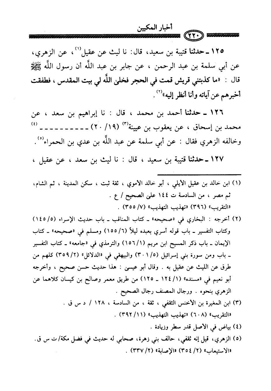 ١٢٥ - حَدثنَا قُتَيْبَة بن سعيد، قَالَ: نَا لَيْث عَن عقيل، عَن الزُّهْرِيّ، عَن أبي سَلمَة بن عبد الرَّحْمَن، عَن جَابر بن عبد الله أَن رَسُول الله صلى الله عَلَيْهِ وَسلم قَالَ: " مَا كذبتني قُرَيْش قُمْت فِي الْحجر فخلى الله لي بَيت الْمُقَدّس، فطفقت أخْبرهُم عَن آيَاته وَأَنا أنظر إِلَيْهِ ".