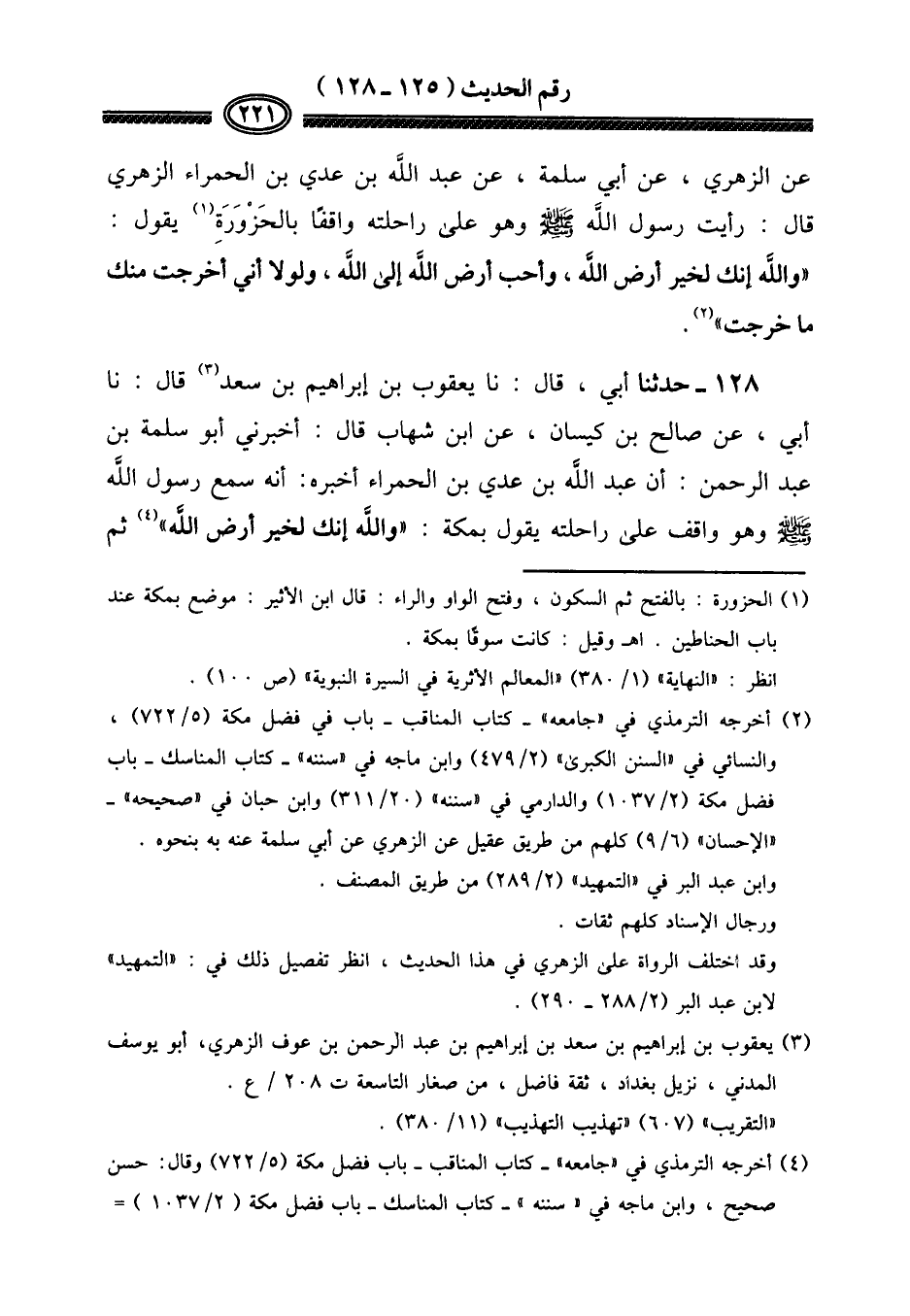 ١٢٨ - حَدثنَا أبي، قَالَ: نَا يَعْقُوب بن إِبْرَاهِيم بن سعد قَالَ: نَا أبي، عَن صَالح بن كيسَان، عَن ابْن شهَاب قَالَ: أَخْبرنِي أَبُو سَلمَة بن عبد الرَّحْمَن: أَن عبد الله بن عدي بن الْحَمْرَاء أخبرهُ: أَنه سمع رَسُول الله صلى الله عَلَيْهِ وَسلم وَهُوَ وَاقِف على رَاحِلَته يَقُول بِمَكَّة: " وَالله إِنَّك لخير أَرض الله " ثمَّ
