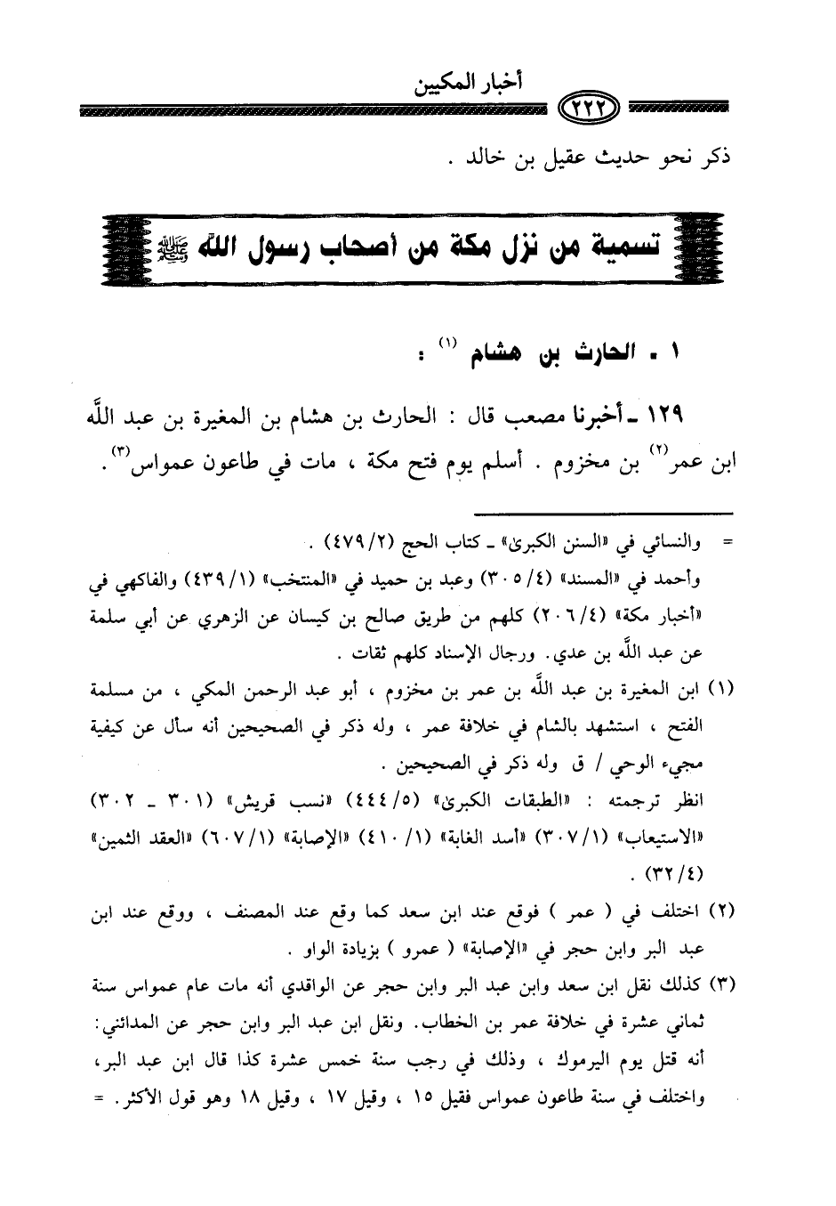 ١٢٩ - أخبرنَا مُصعب قَالَ: الْحَارِث بن هِشَام بن الْمُغيرَة بن عبد الله ابْن عمر بن مَخْزُوم. أسلم يَوْم فتح مَكَّة، مَاتَ فِي طاعون عمواس.