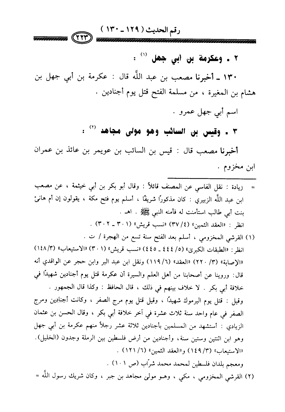 ١٣٠ - أخبرنَا مُصعب بن عبد الله قَالَ: عِكْرِمَة بن أبي جهل بن هِشَام بن الْمُغيرَة، من مسلمة الْفَتْح قتل يَوْم أجنادين.