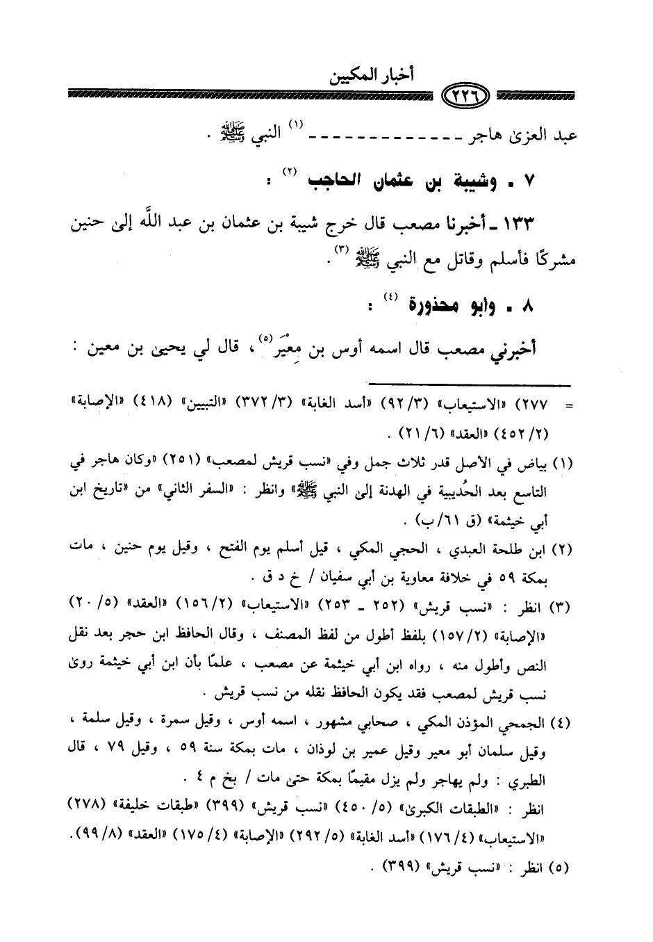 ١٣٣ - أخبرنَا مُصعب قَالَ خرج شيبَة بن عُثْمَان بن عبد الله إِلَى حنين مُشْركًا فَأسلم وَقَاتل مَعَ النَّبِي صلى الله عَلَيْهِ وَسلم. (٨ - وَأَبُو مَحْذُورَة:)