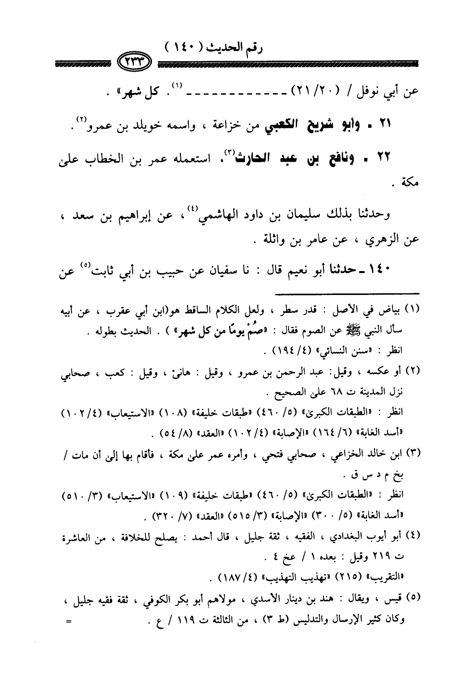 عَن أبي نَوْفَل / (٢٠ / ٢١) -. كل شهر ". (٢١ - وَأَبُو شُرَيْح الكعبي) من خُزَاعَة، واسْمه خويلد بن عَمْرو. (٢٢ - وَنَافِع بن عبد الْحَارِث) ، وَاسْتَعْملهُ عمر بن الْخطاب على مَكَّة.