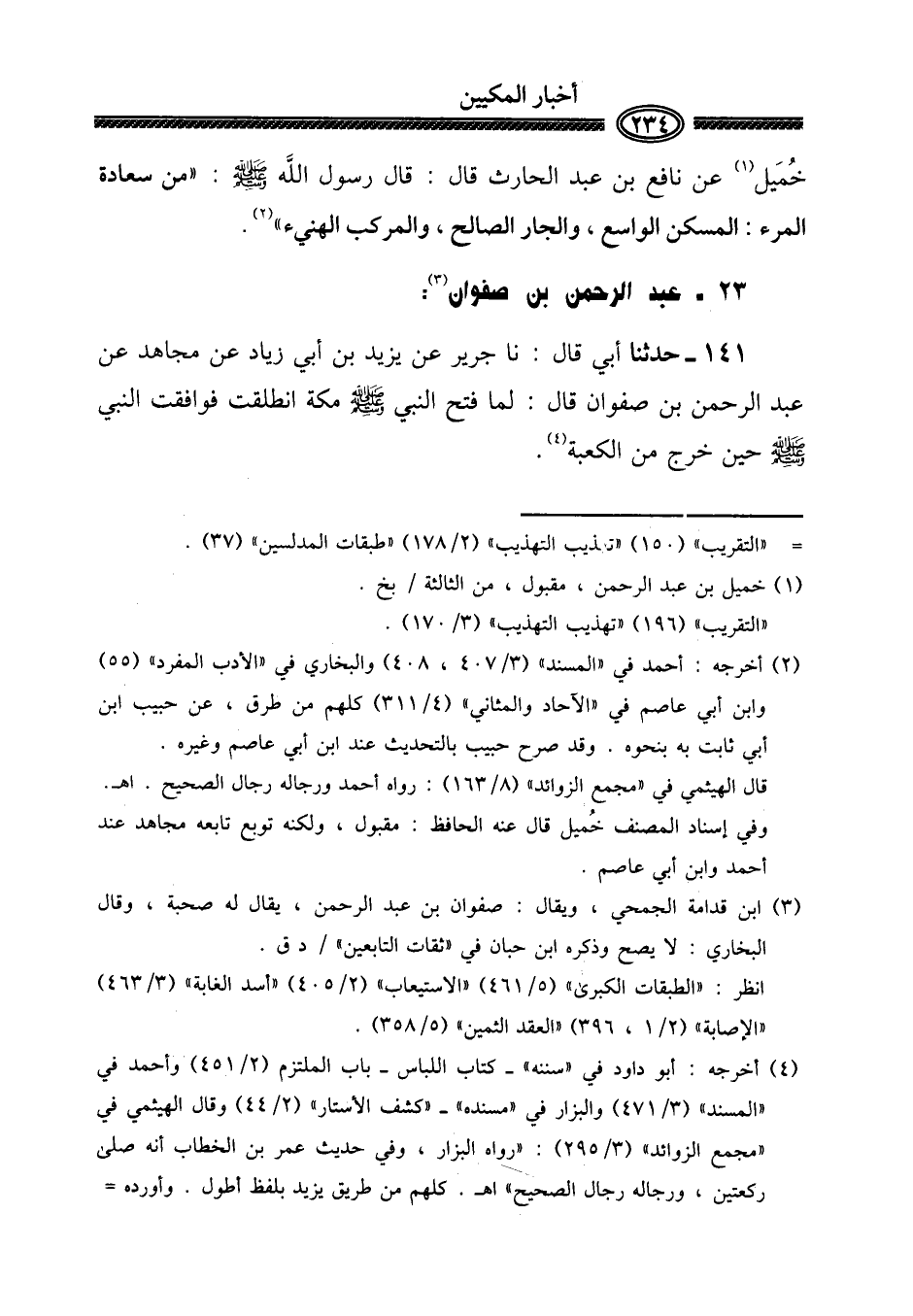 خمَيل عَن نَافِع بن عبد الْحَارِث قَالَ: قَالَ رَسُول الله صلى الله عَلَيْهِ وَسلم: " من سَعَادَة الْمَرْء: الْمسكن الْوَاسِع، وَالْجَار الصَّالح، والمركب الهنيء ". (٢٣ - عبد الرَّحْمَن بن صَفْوَان:)