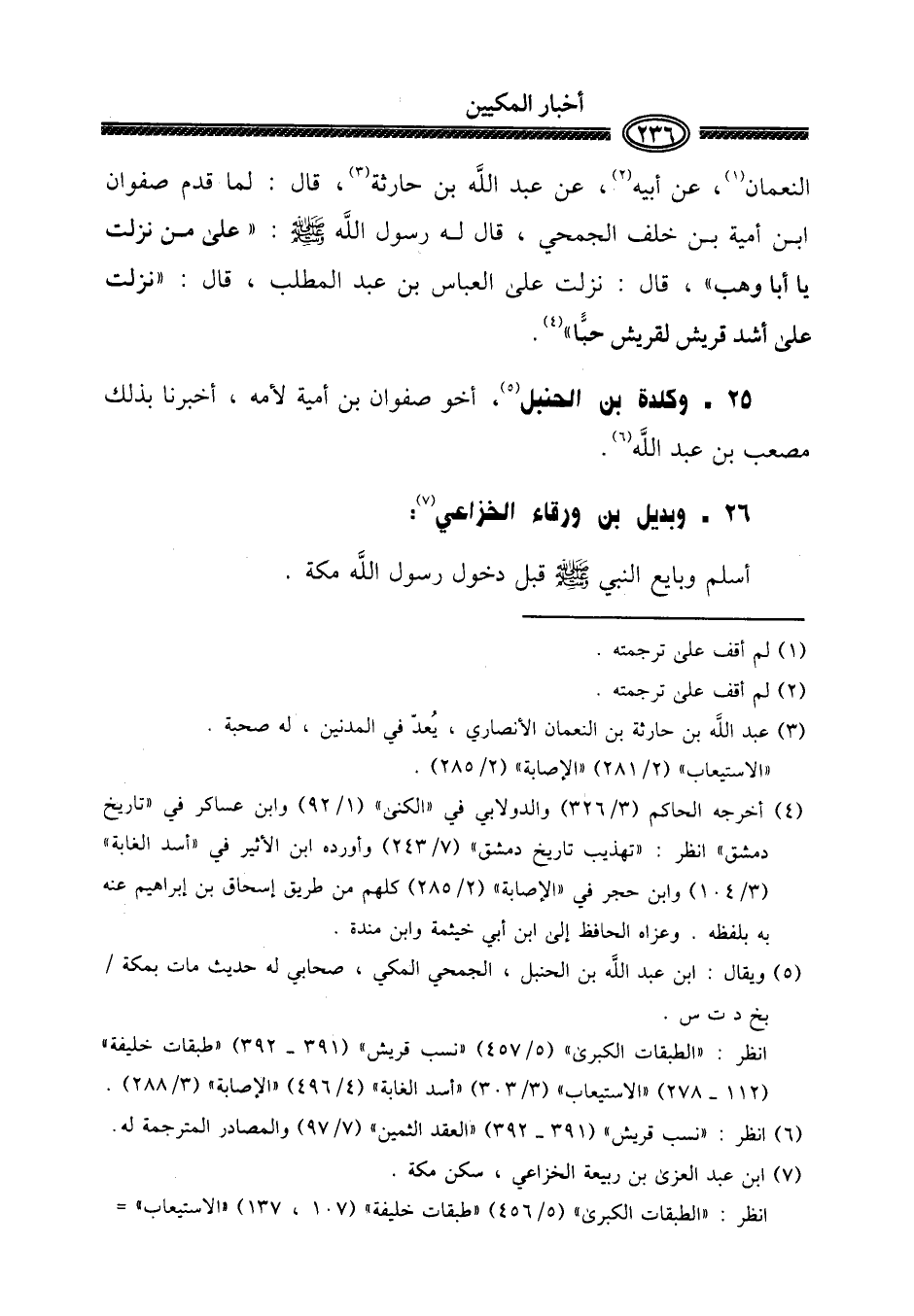 النُّعْمَان، عَن أَبِيه، عَن عبد الله بن حَارِثَة، قَالَ: لما قدم صَفْوَان ابْن أُميَّة بن خلف الجُمَحِي، قَالَ لَهُ رَسُول الله صلى الله عَلَيْهِ وَسلم: " على من نزلت يَا أَبَا وهب "، قَالَ: نزلت على الْعَبَّاس بن عبد الْمطلب، قَالَ: " نزلت على أَشد قُرَيْش لقريش حبًّا ". (٢٥ - وكلدة بن الحنبل) ، أَخُو صَفْوَان بن أُميَّة لأمه، أخبرنَا بذلك مُصعب بن عبد الله. (٢٦ - وَبُدَيْل بن وَرْقَاء الْخُزَاعِيّ:)