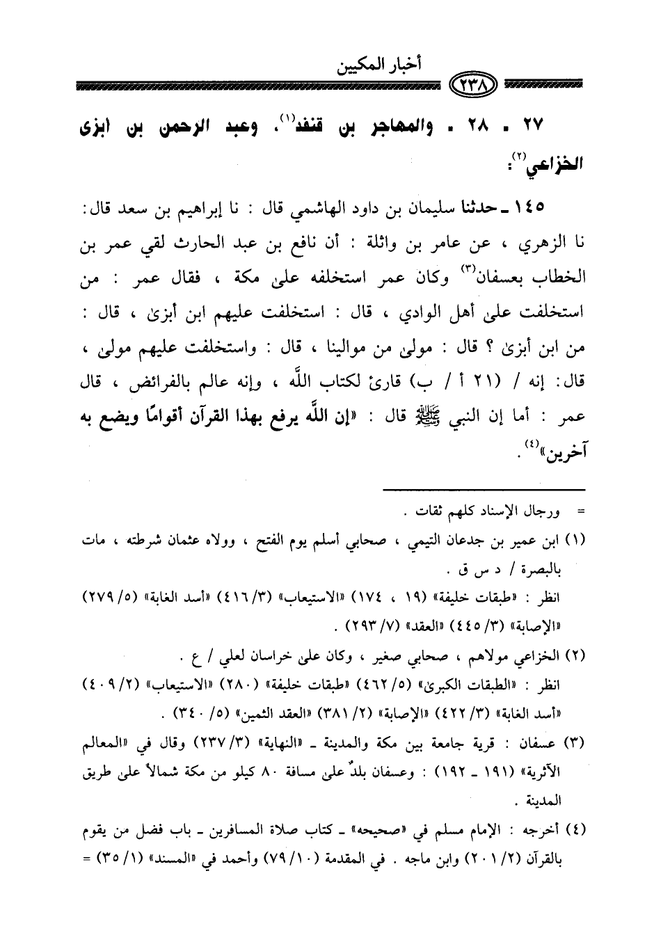 ١٤٥ - حَدثنَا سُلَيْمَان بن دَاوُد الْهَاشِمِي قَالَ: نَا إِبْرَاهِيم بن سعد قَالَ: نَا الزُّهْرِيّ، عَن عَامر بن وَاثِلَة: أَن نَافِع بن عبد الْحَارِث لَقِي عمر بن الْخطاب بعسفان وَكَانَ عمر اسْتَخْلَفَهُ على مَكَّة، فَقَالَ عمر: من اسْتخْلفت على أهل الْوَادي، قَالَ: اسْتخْلفت عَلَيْهِم ابْن أَبْزَى، قَالَ: من ابْن أَبْزَى؟ قَالَ: مولى من موالينا، قَالَ: اسْتخْلفت عَلَيْهِم مولى، قَالَ: إِنَّه / ٢١ أ / ب) قَارِئ لكتاب الله، وَإنَّهُ عَالم بالفرائض، قَالَ عمر: أما إِن النَّبِي صلى الله عَلَيْهِ وَسلم قَالَ: " إِن الله يرفع بِهَذَا الْقُرْآن أَقْوَامًا وَيَضَع بِهِ آخَرين ".