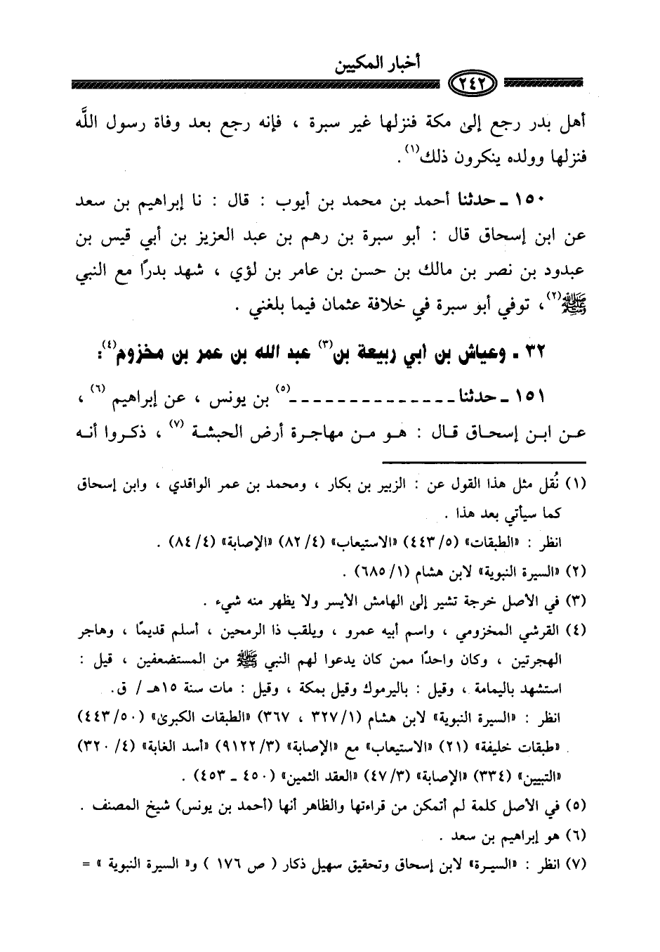 ١٥٠ - حَدثنَا أَحْمد بن مُحَمَّد بن أَيُّوب: قَالَ: نَا إِبْرَاهِيم بن سعد عَن ابْن إِسْحَاق قَالَ: أَبُو سُبْرَة بن رهم بن عبد الْعَزِيز بن أبي قيس بن عبدون بن نصر بن مَالك بن حسن بن عَامر بن لؤَي، شهد بَدْرًا مَعَ النَّبِي صلى الله عَلَيْهِ وَسلم، توفّي أَبُو سُبْرَة فِي خلَافَة عُثْمَان فِيمَا بَلغنِي. (٣٢ - وَعَيَّاش بن أبي ربيعَة بن عبد الله بن عمر بن مَخْزُوم:)
