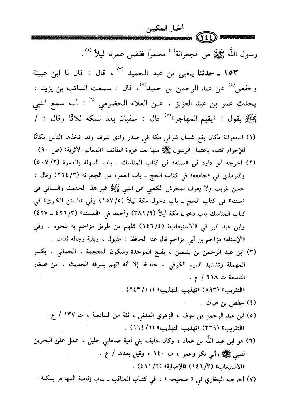 ١٥٣ - حَدثنَا يحيى بن عبد الحميد، قَالَ: قَالَ نَا ابْن عُيَيْنَة وَحَفْص عَن عبد الرَّحْمَن بن حميد، قَالَ: سَمِعت السَّائِب بن يزِيد، يحدث عمر بن عبد الْعَزِيز، عَن الْعَلَاء الْحَضْرَمِيّ: أَنه سمع النَّبِي صلى الله عَلَيْهِ وَسلم يَقُول: " يُقيم المُهَاجر " قَالَ: سُفْيَان بعد نُسكه ثَلَاثًا وَقَالَ: /