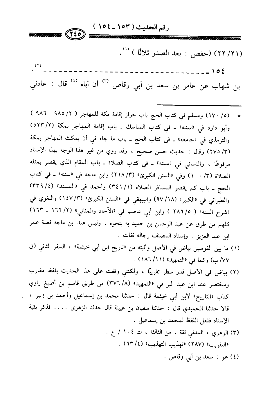 ١٥٤ - -. ابْن شهَاب عَن عَامر بن سعد بن أبي وَقاص أَن أَبَاهُ قَالَ: عادني