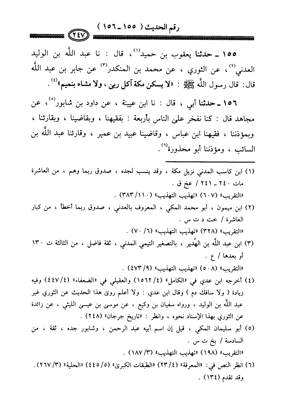 ١٥٥ - حَدثنَا يَعْقُوب بن حميد، قَالَ: نَا عبد الله بن الْوَلِيد الْعَدنِي، عَن الثَّوْريّ، عَن مُحَمَّد بن الْمُنْكَدر عَن جَابر بن عبد الله قَالَ: قَالَ رَسُول الله صلى الله عَلَيْهِ وَسلم: " لَا يسكن مَكَّة آكل ربى، وَلَا مشاء بنميم "