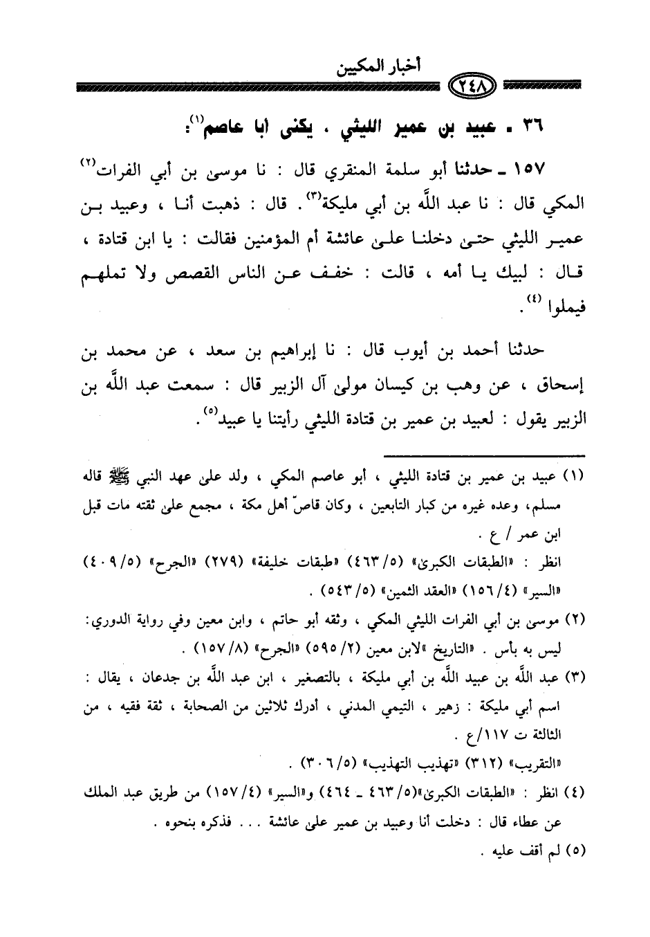 ١٥٧ - حَدثنَا أَبُو سَلمَة الْمنْقري قَالَ: نَا مُوسَى بن أبي الْفُرَات الْمَكِّيّ قَالَ: نَا عبد الله بن أبي مليكَة. قَالَ: ذهبت أَنا، وَعبيد بن عُمَيْر اللَّيْثِيّ حَتَّى دَخَلنَا على عَائِشَة أم الْمُؤمنِينَ فَقَالَت: يَا ابْن قَتَادَة، قَالَ: لبيْك يَا أمه، قَالَت: خفف عَن النَّاس الْقَصَص وَلَا تملهم فيملوا.