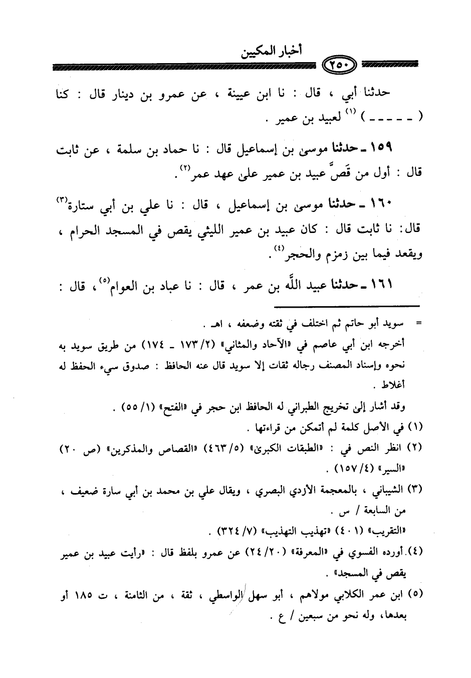 ١٦٠ - حَدثنَا مُوسَى بن إِسْمَاعِيل، قَالَ: نَا عَليّ بن أبي ستارة قَالَ: نَا ثَابت قَالَ: كَانَ عبيد بن عُمَيْر اللَّيْثِيّ يقص فِي الْمَسْجِد الْحَرَام، وَيقْعد فِيمَا بَين زَمْزَم وَالْحجر.