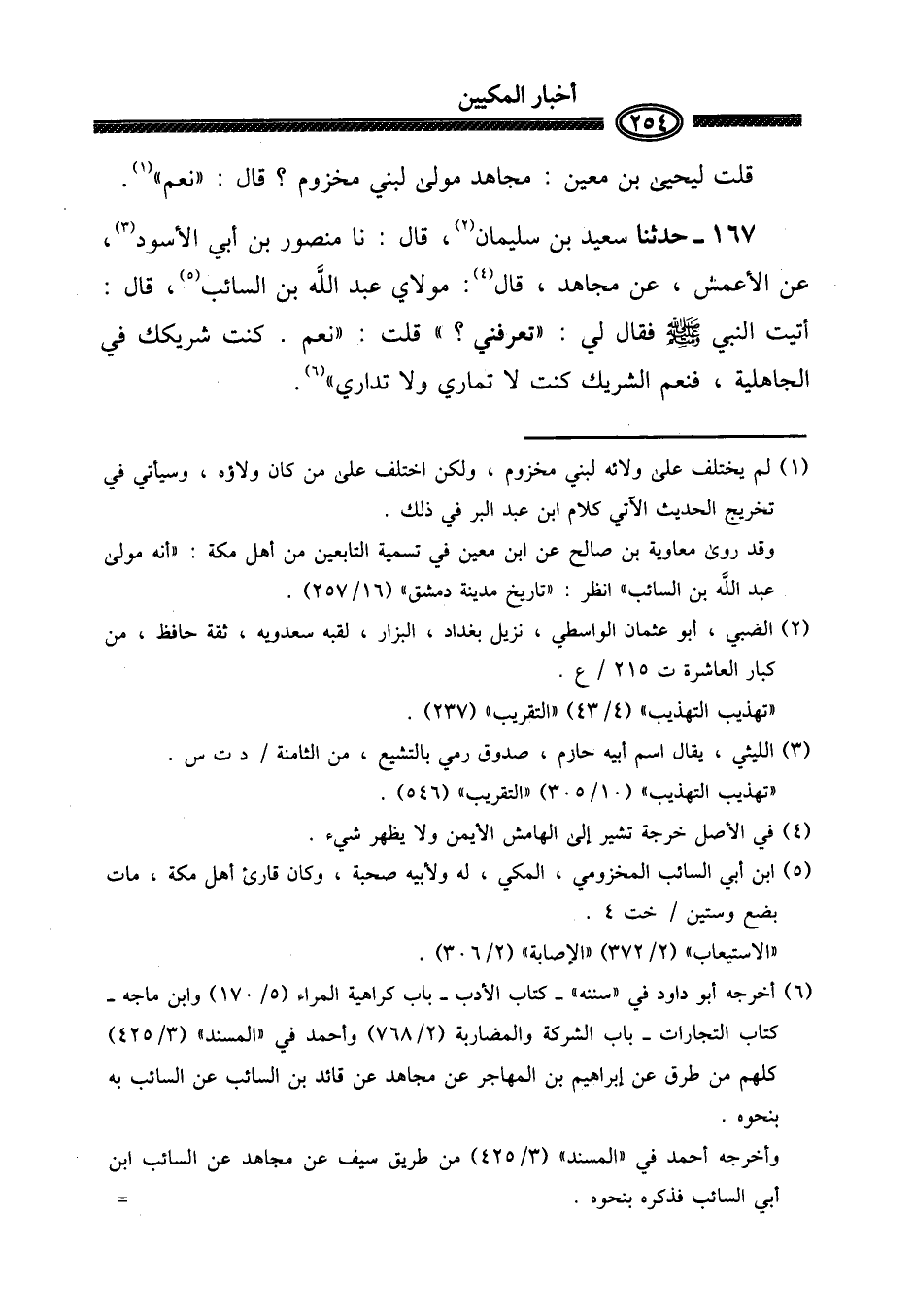 ١٦٧ - حَدثنَا سعيد بن سُلَيْمَان، قَالَ: نَا مَنْصُور بن أبي الْأسود، عَن الْأَعْمَش، عَن مُجَاهِد، قَالَ: مولَايَ عبد الله بن السَّائِب، قَالَ: أتيت النَّبِي صلى الله عَلَيْهِ وَسلم فَقَالَ لي: " تعرفنِي؟ " قلت: " نعم. كنت شريكك فِي الْجَاهِلِيَّة، فَنعم الشَّرِيك كنت لَا تُمَارِي وَلَا تُدَارِي ".