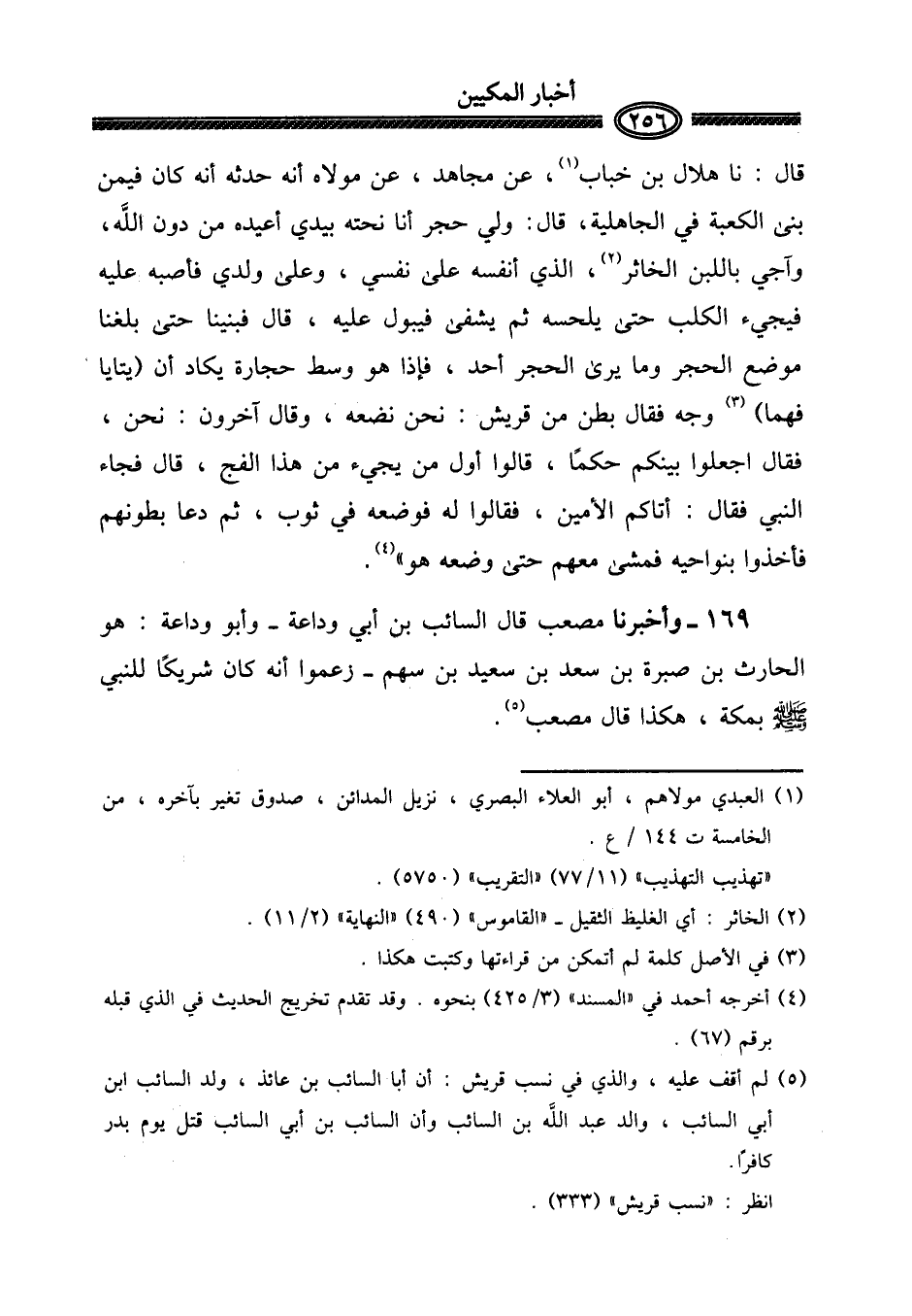 ١٦٩ - وَأخْبرنَا مُصعب قَالَ السَّائِب بن أبي ودَاعَة - وَأَبُو ودَاعَة: هُوَ الْحَارِث بن صبرَة بن سعد بن سعيد بن سهم - زَعَمُوا أَنه كَانَ شَرِيكا للنَّبِي صلى الله عَلَيْهِ وَسلم بِمَكَّة، هَكَذَا قَالَ مُصعب.